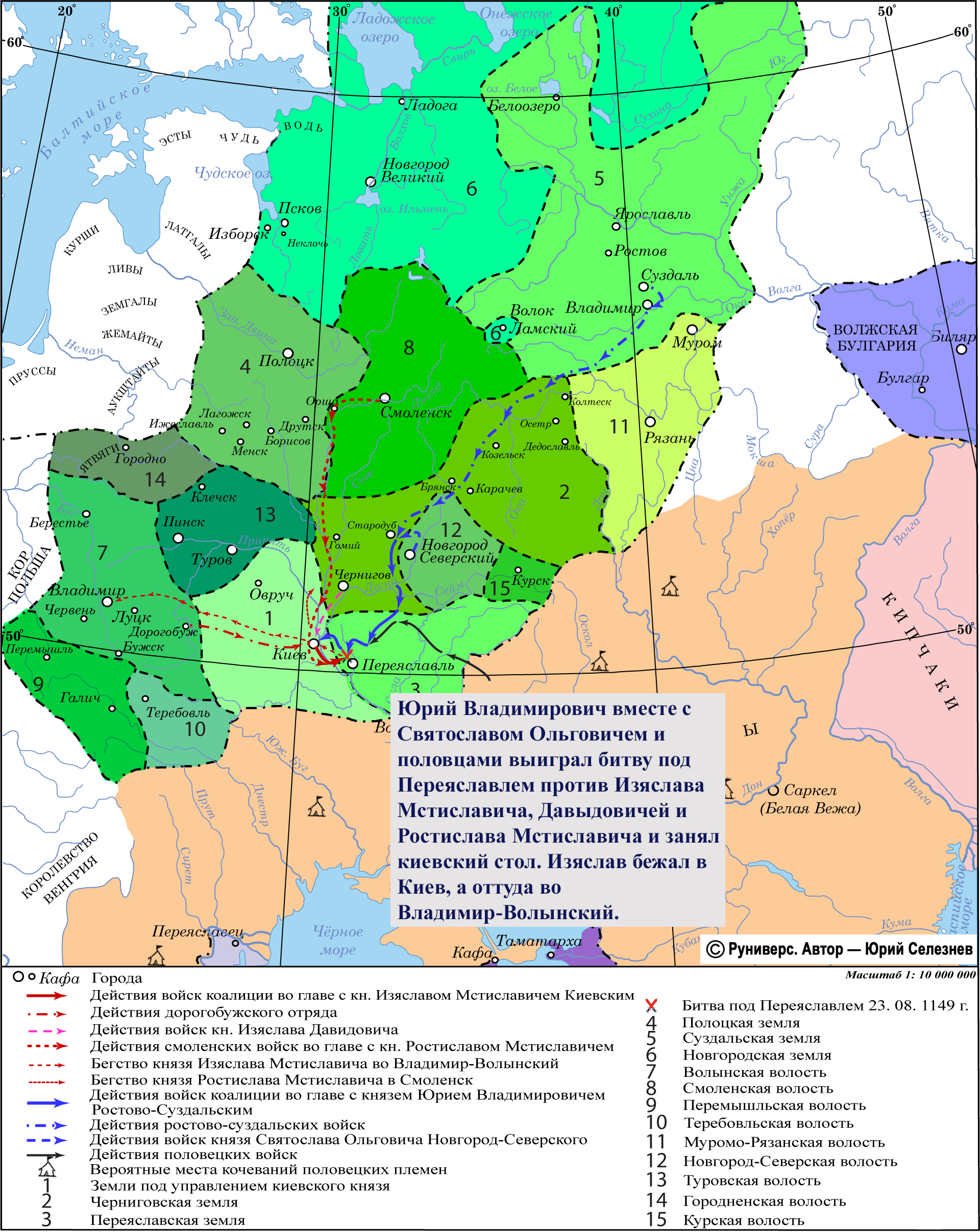 Юрий Владимирович вместе с Святославом Ольговичем и половцами выиграл битву под Переяславлем против Изяслава Мстиславича, Давыдовичей и Ростислава Мстиславича и занял киевский стол. Изяслав бежал в Киев, а оттуда во Владимир-Волынский.