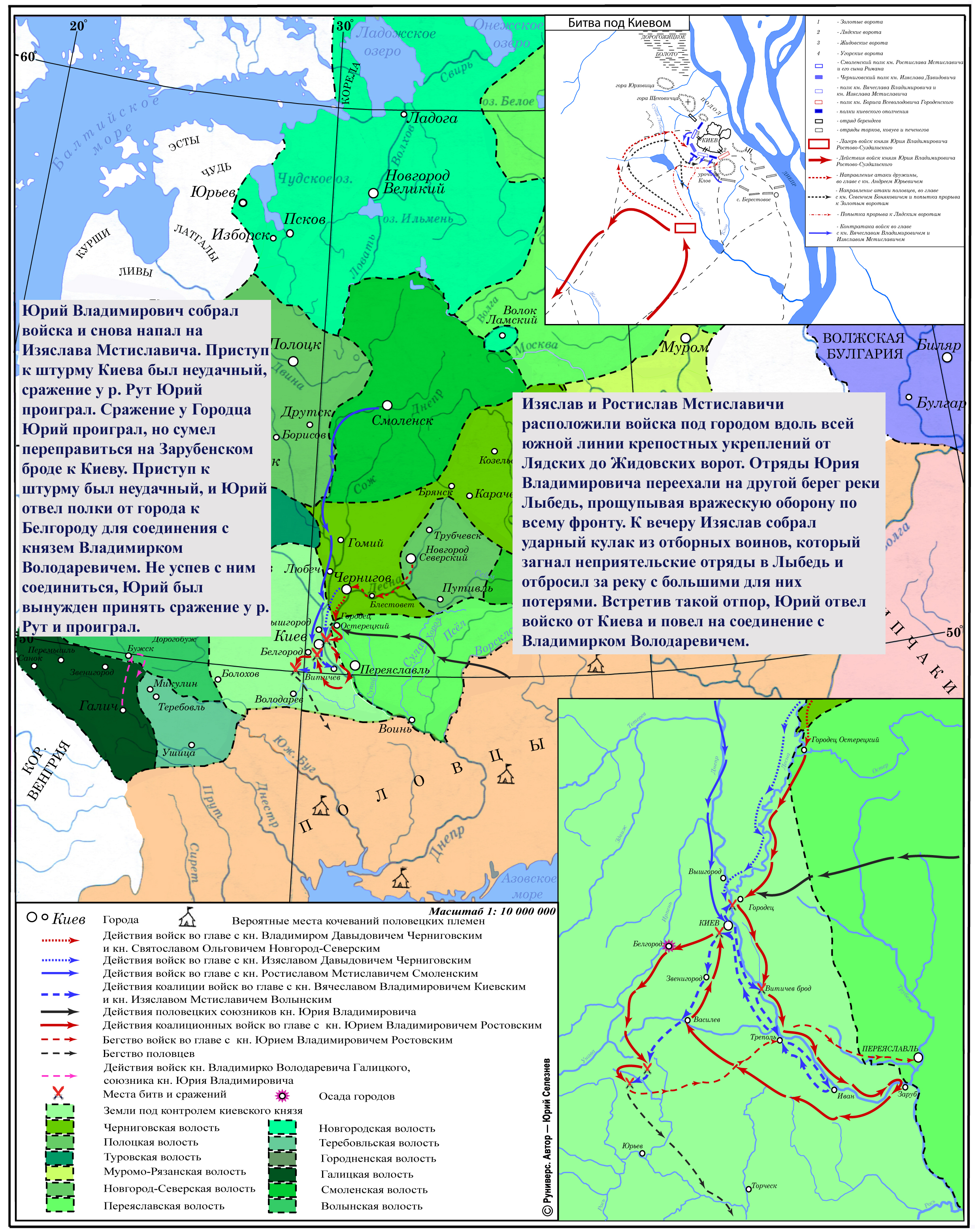 Юрий Владимирович собрал войска и снова напал на Изяслава Мстиславича. Приступ к штурму Киева был неудачный, сражение у р. Рут Юрий проиграл. Сражение у Городца Юрий проиграл, но сумел переправиться на Зарубенском броде к Киеву. Приступ к штурму был неудачный, и Юрий отвел полки от города к Белгороду для соединения с князем Владимирком Володаревичем. Не успев с ним соединиться, Юрий был вынужден принять сражение у р. Рут и проиграл. Изяслав и Ростислав Мстиславичи расположили войска под городом вдоль всей южной линии крепостных укреплений от Лядских до Жидовских ворот. Отряды Юрия Владимировича переехали на другой берег реки Лыбедь, прощупывая вражескую оборону по всему фронту. К вечеру Изяслав собрал ударный кулак из отборных воинов, который загнал неприятельские отряды в Лыбедь и отбросил за реку с большими для них потерями. Встретив такой отпор, Юрий отвел войско от Киева и повел на соединение с Владимирком Володаревичем.