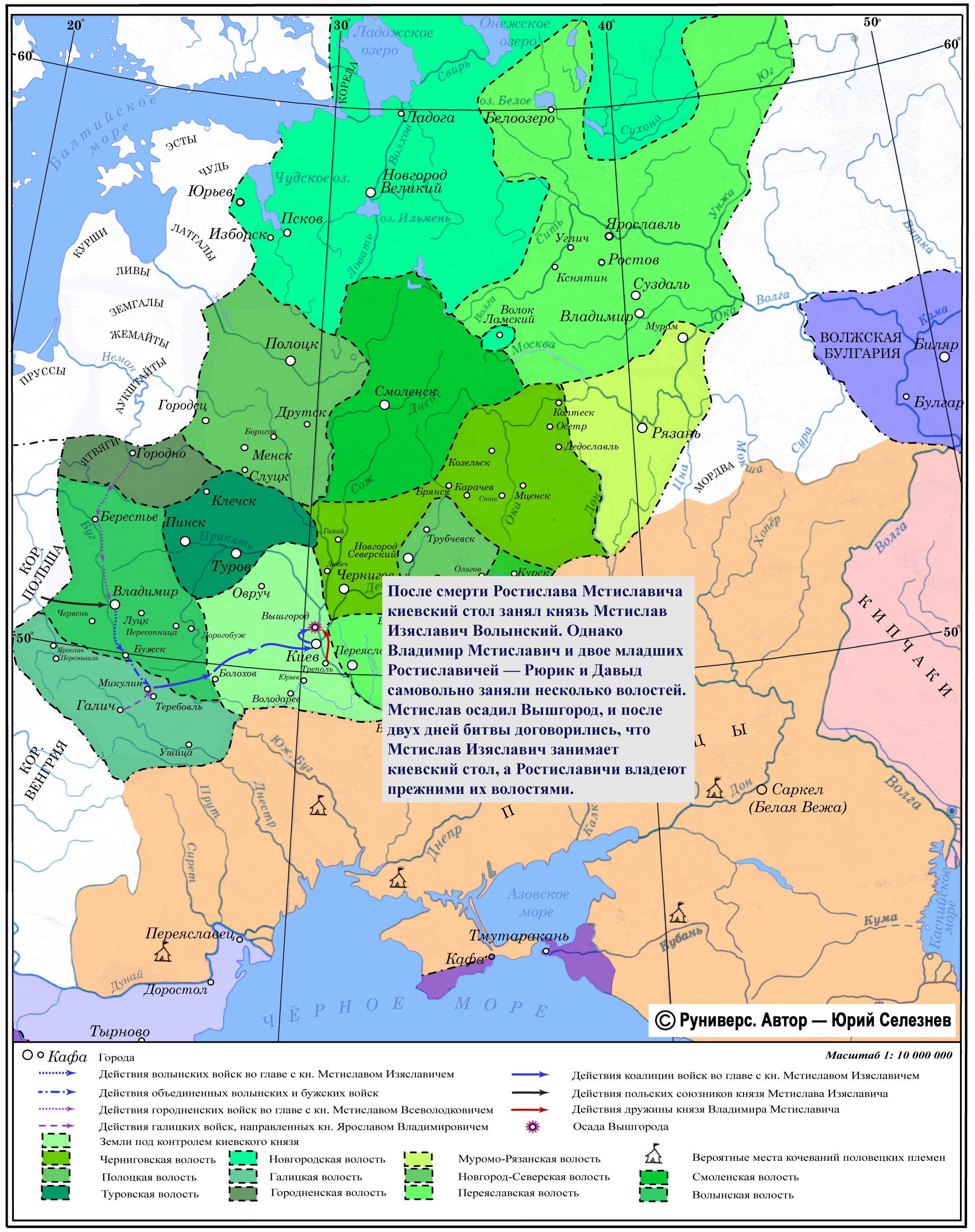 После смерти Ростислава Мстиславича киевский стол занял князь Мстислав Изяславич Волынский. Однако Владимир Мстиславич и двое младших Ростиславичей — Рюрик и Давыд самовольно заняли несколько волостей. Мстислав осадил Вышгород, и после двух дней битвы договорились, что Мстислав Изяславич занимает киевский стол, а Ростиславичи владеют прежними их волостями.