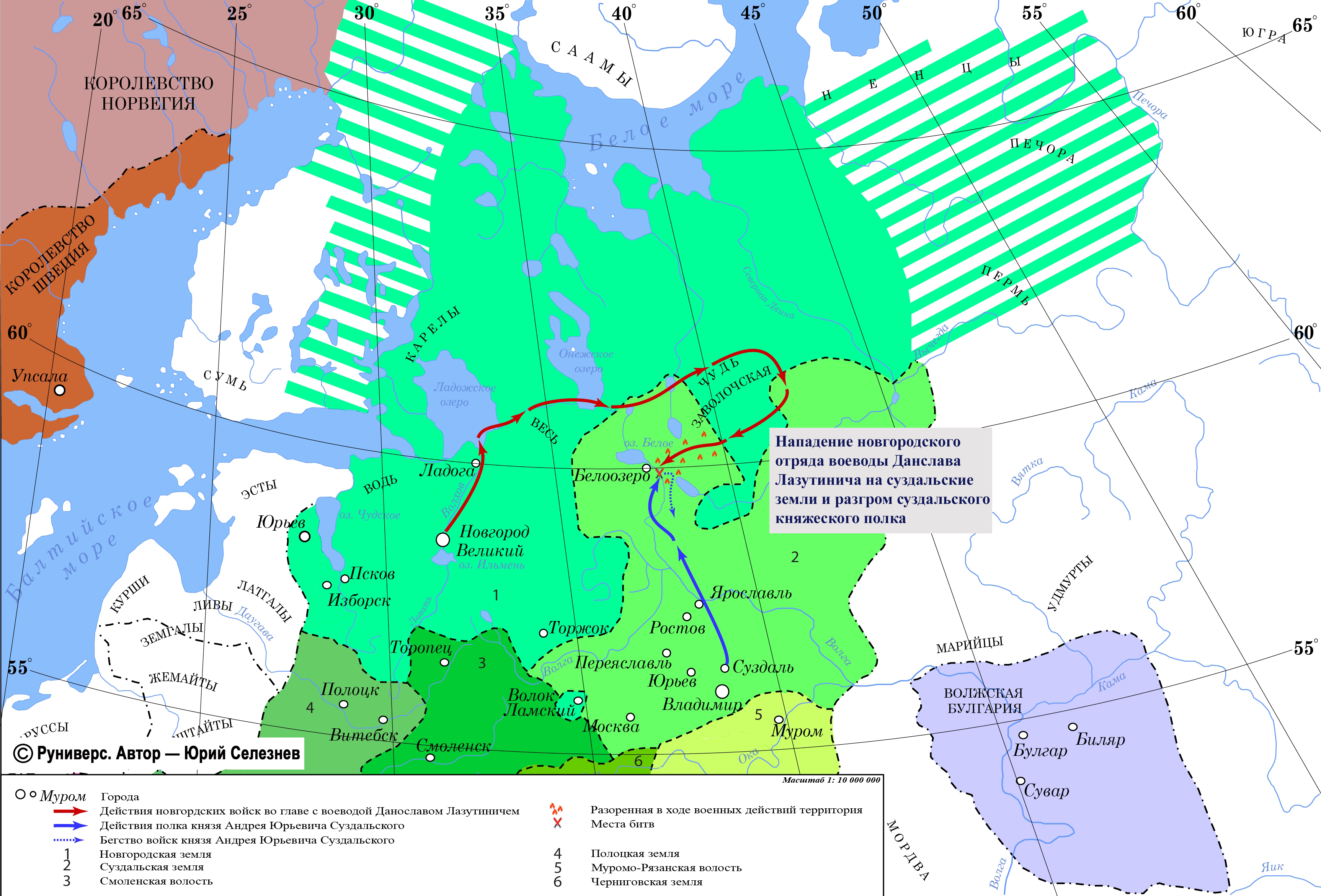 Князь суздальский Андрей Юрьевич мешал собирать подати новгородским чиновникам. В ответ новгородский отряд во главе с воеводой Данславом Лазутиничем разгромил суздальский княжеский полк и собрал дань с владений князя Андрея Боголюбского.