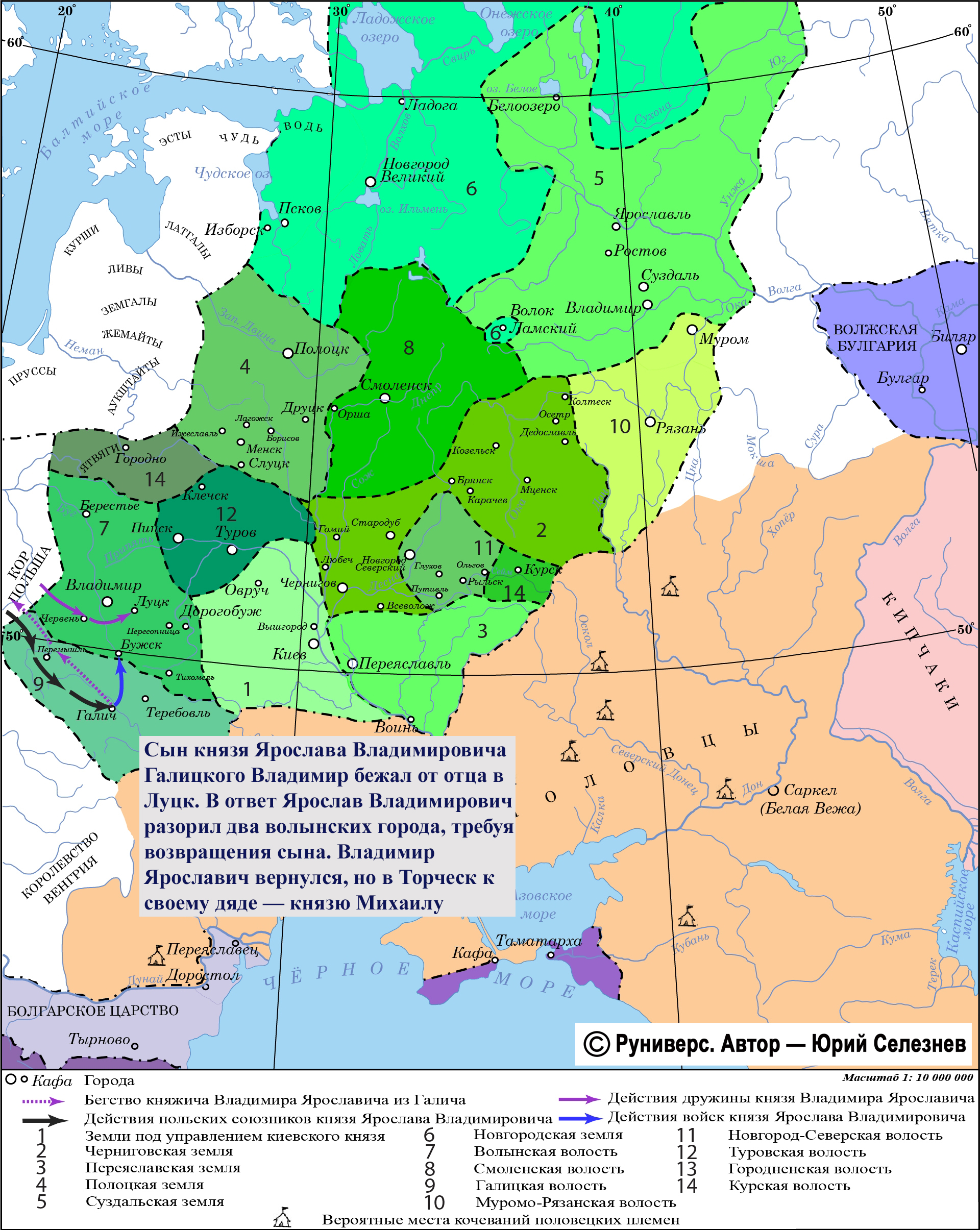 В 1172 г. начались неурядицы в семье князя Ярослава Владимировича Галицкого. Его жена, княгиня Ольга, и сын Владимир, будучи возмущены тем, что князь завел любовницу, покинули Галич и отправились сначала в Польшу, а затем укрылись в Луцке. Владимир обещал укрывшему его Ярославу Изяславичу Луцкому возвратить волынские города. Ярослав Владимирович пригласил поляков и с ними разорил два волынских города, требуя, чтобы ему выдали сына. В результате князь Ярослав Изяславич Луцкий отправил бежавшего от отца Владимира Ярославича в Торческ к его дяде — князю Михаилу Юрьевичу.