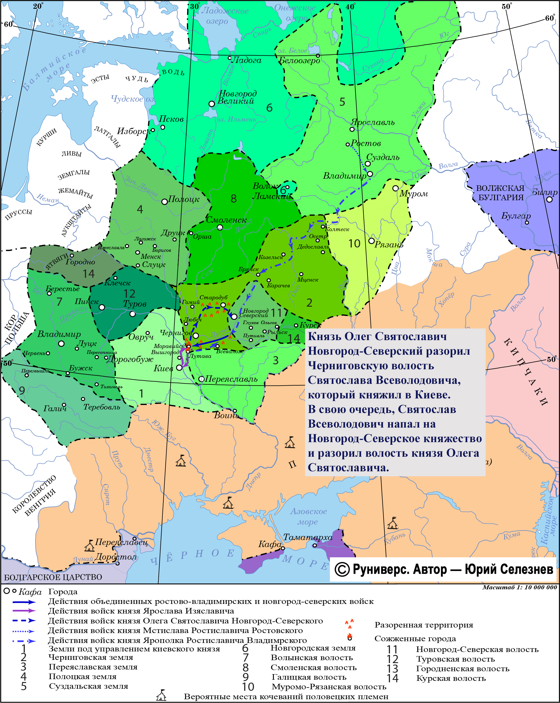 Князь Олег Святославич Новгород-Северский разорил черниговскую волость Святослава Всеволодовича, который княжил в Киеве. Поэтому он был вынужден примириться с Ярославом Изяславичем, который вернулся в Киев. После чего Святослав Всеволодович напал уже на Новгород-Северское княжество и разорил волость князя Олега Святославича.