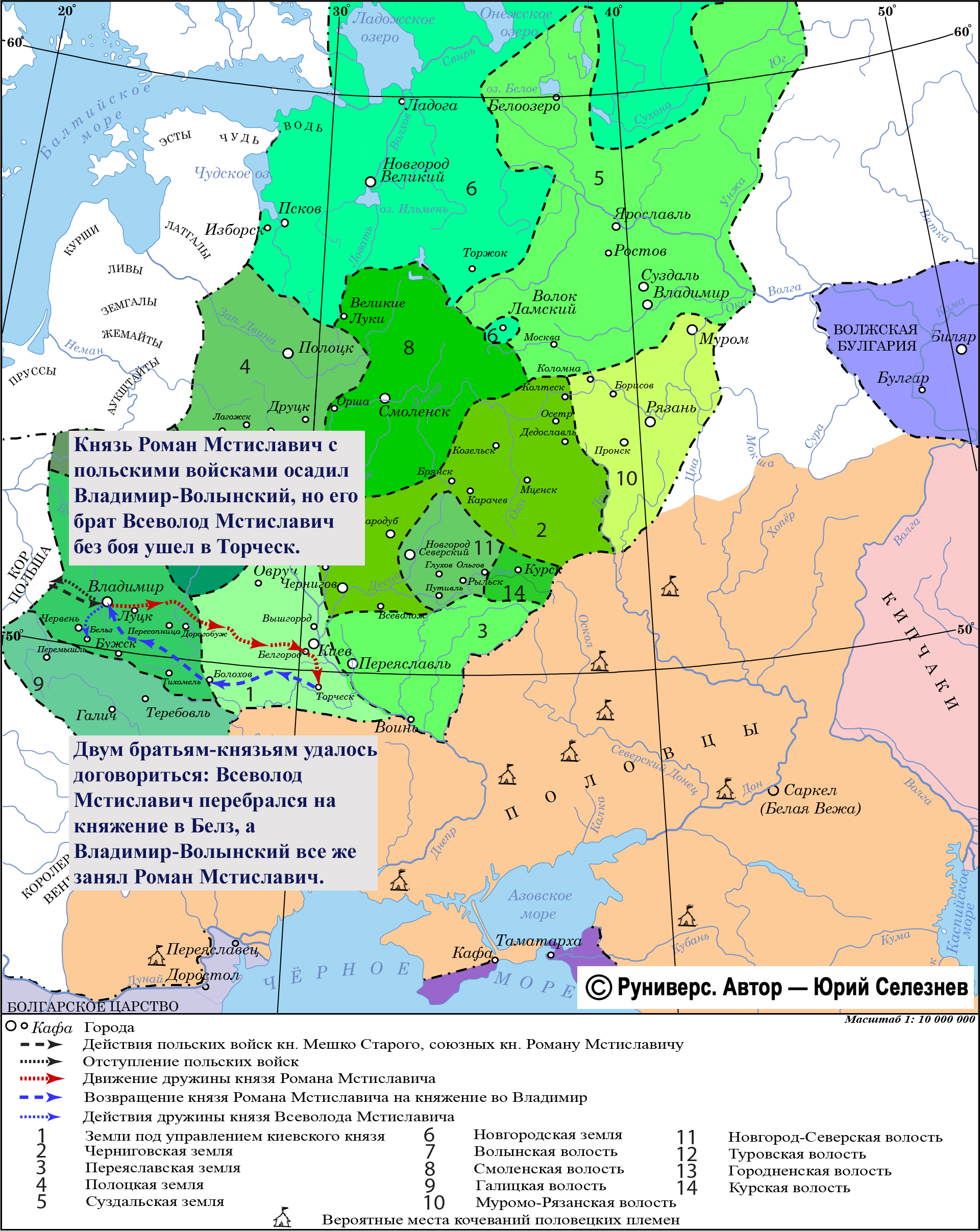 Князь Роман Мстиславич нашел в Польше поддержку у князя Мешко Старого. С польскими войсками князь Роман подошел к Владимиру-Волынскому, но штурмовать город, где держал осаду его брат Всеволод Мстиславич, он не стал и вернулся ко двору князя Рюрика Ростиславича, который предложил Роману княжение в Торческе.