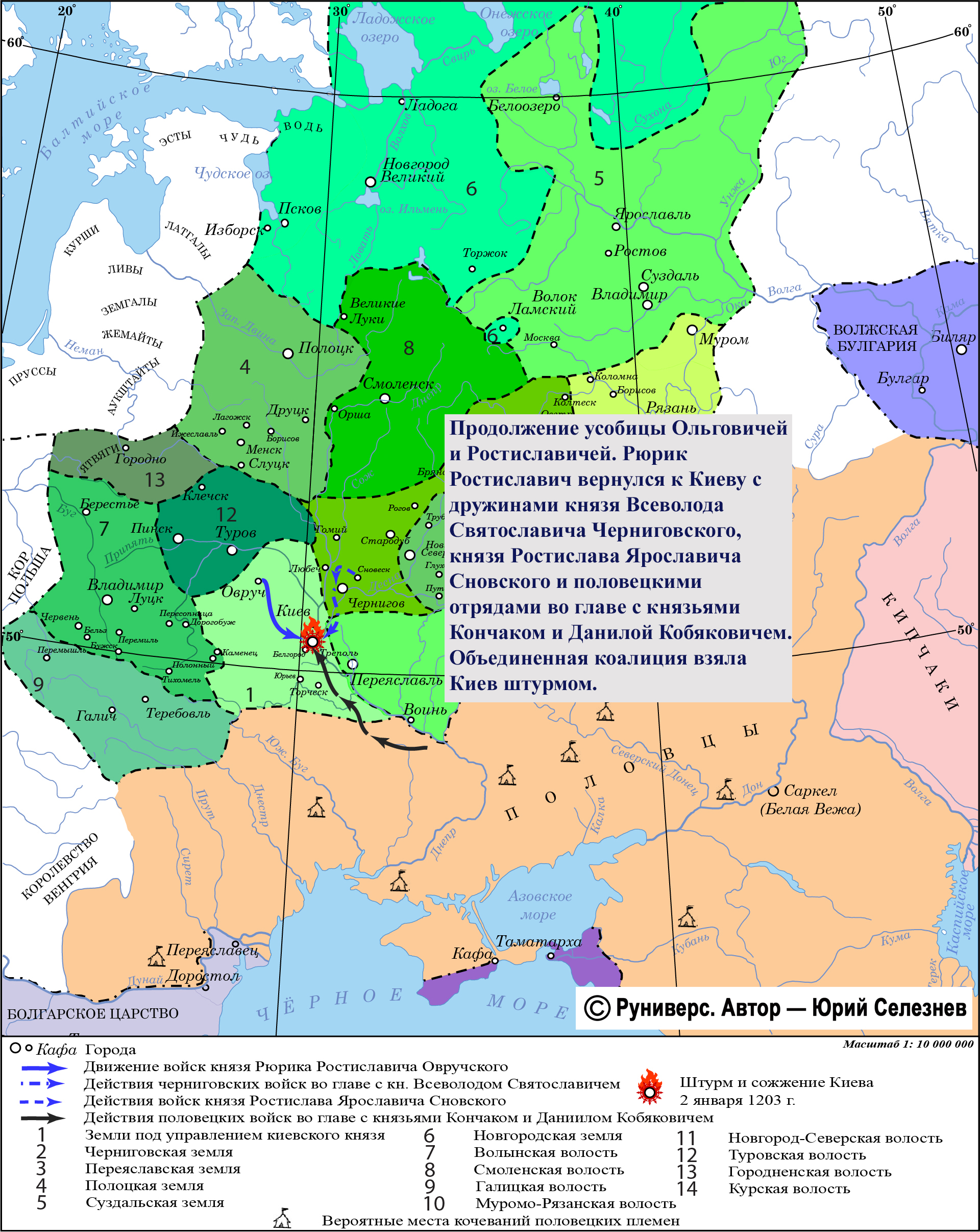 Продолжение усобицы Ольговичей и Ростиславичей. Рюрик Ростиславич вернулся к Киеву с дружинами князя Всеволода Святославича Черниговского, князя Ростислава Ярославича Сновского и половецкими отрядами во главе с князьями Кончаком и Данилой Кобяковичем. Объединенная коалиция взяла Киев штурмом.