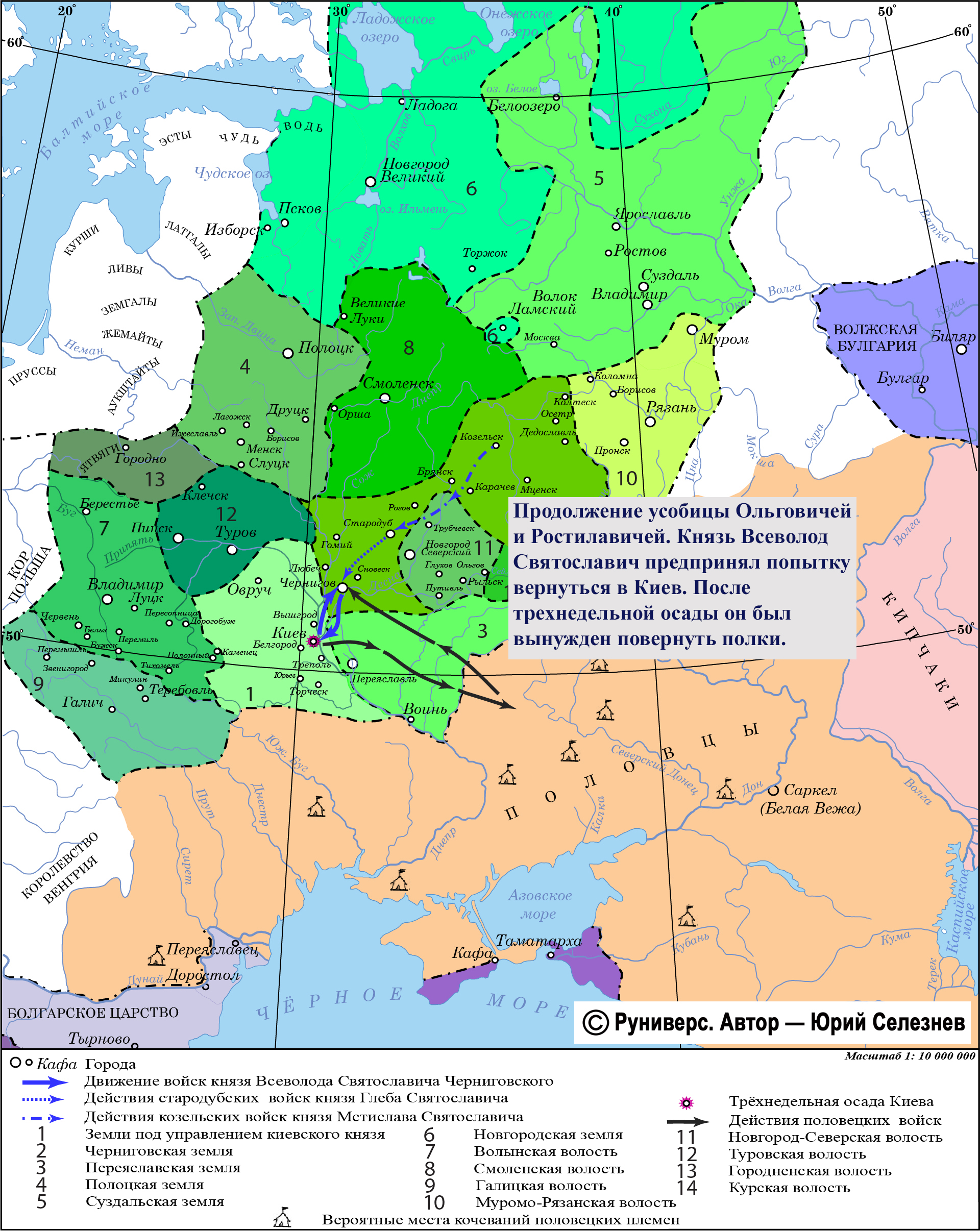 Продолжение усобицы Ольговичей и Ростиславичей. Князь Всеволод Святославич предпринял попытку вернуться в Киев. После трехнедельной осады он был вынужден повернуть полки.