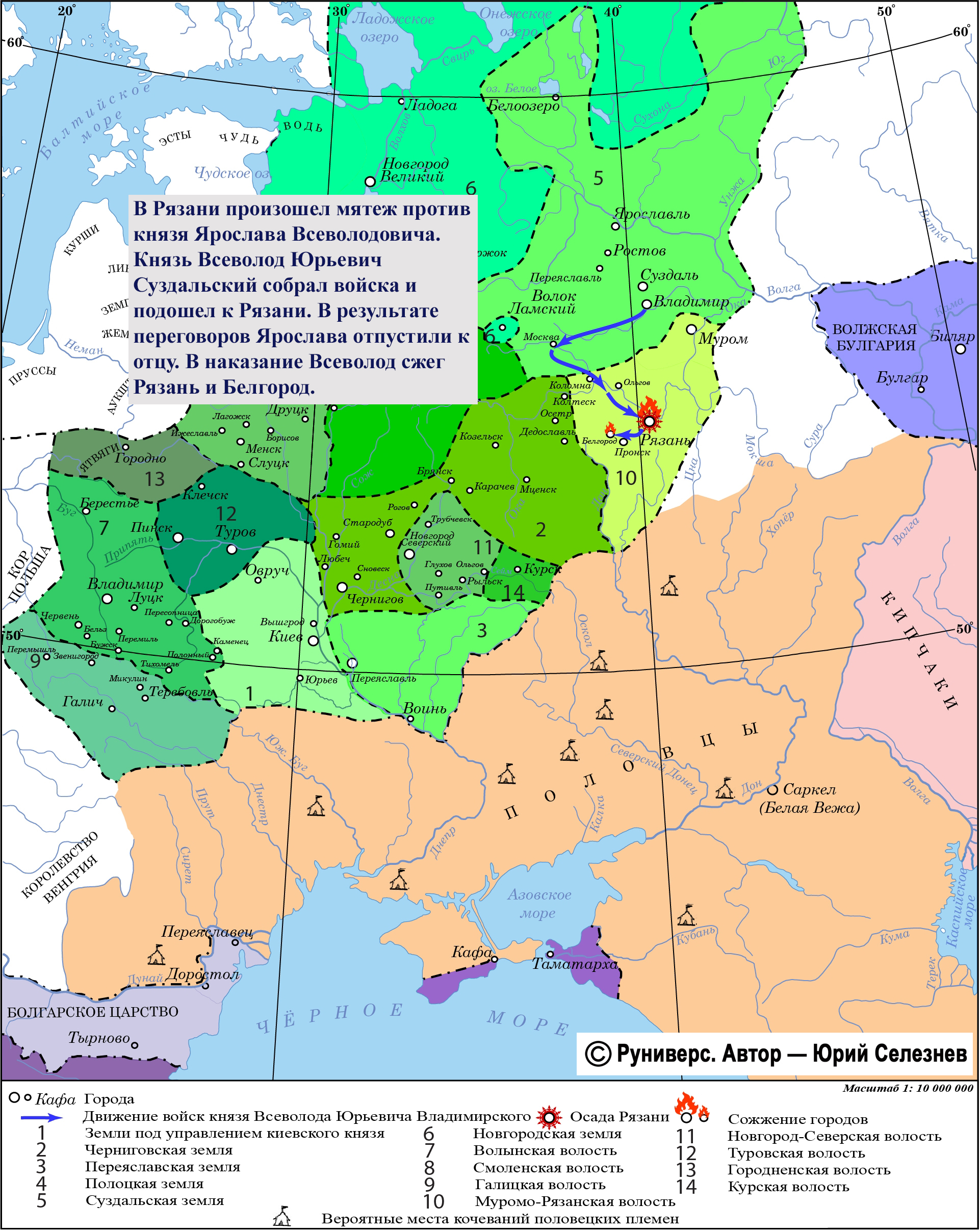 В Рязани произошел мятеж против князя Ярослава Всеволодовича, который был посажен на княжение князем Всеволодом Юрьевичем Суздальским. Он собрал войска и подошел к Рязани. В результате переговоров Ярослава отпустили к отцу. Однако князь Всеволод приказал вывести людей из города и сжечь его. Затем князь Всеволод направил войска на Белгород, который также сжег.