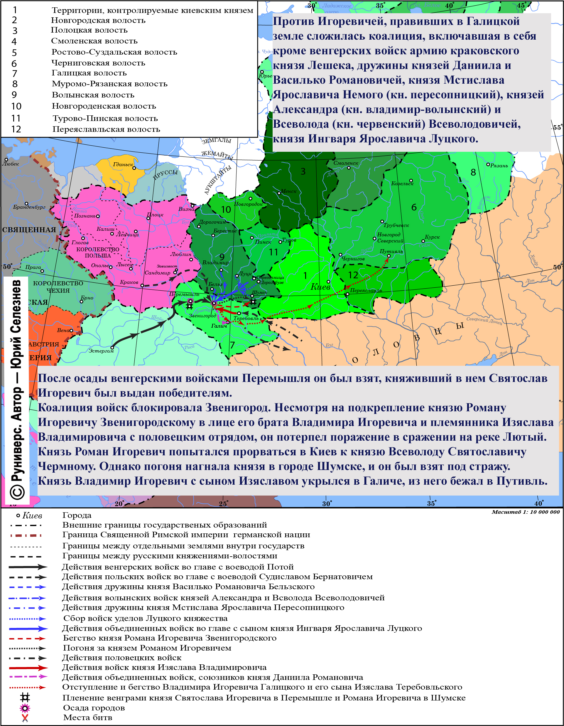 Против Игоревичей, правивших в Галицкой земле, сложилась коалиция, включавшая в себя кроме венгерских войск армию краковского князя Лешека, дружины князей Даниила и Василько Романовичей, князя Мстислава Ярославича Немого (кн. пересопницкий), князей Александра (кн. владимир-волынский) и Всеволода (кн. червенский) Всеволодовичей, князя Ингваря Ярославича Луцкого.