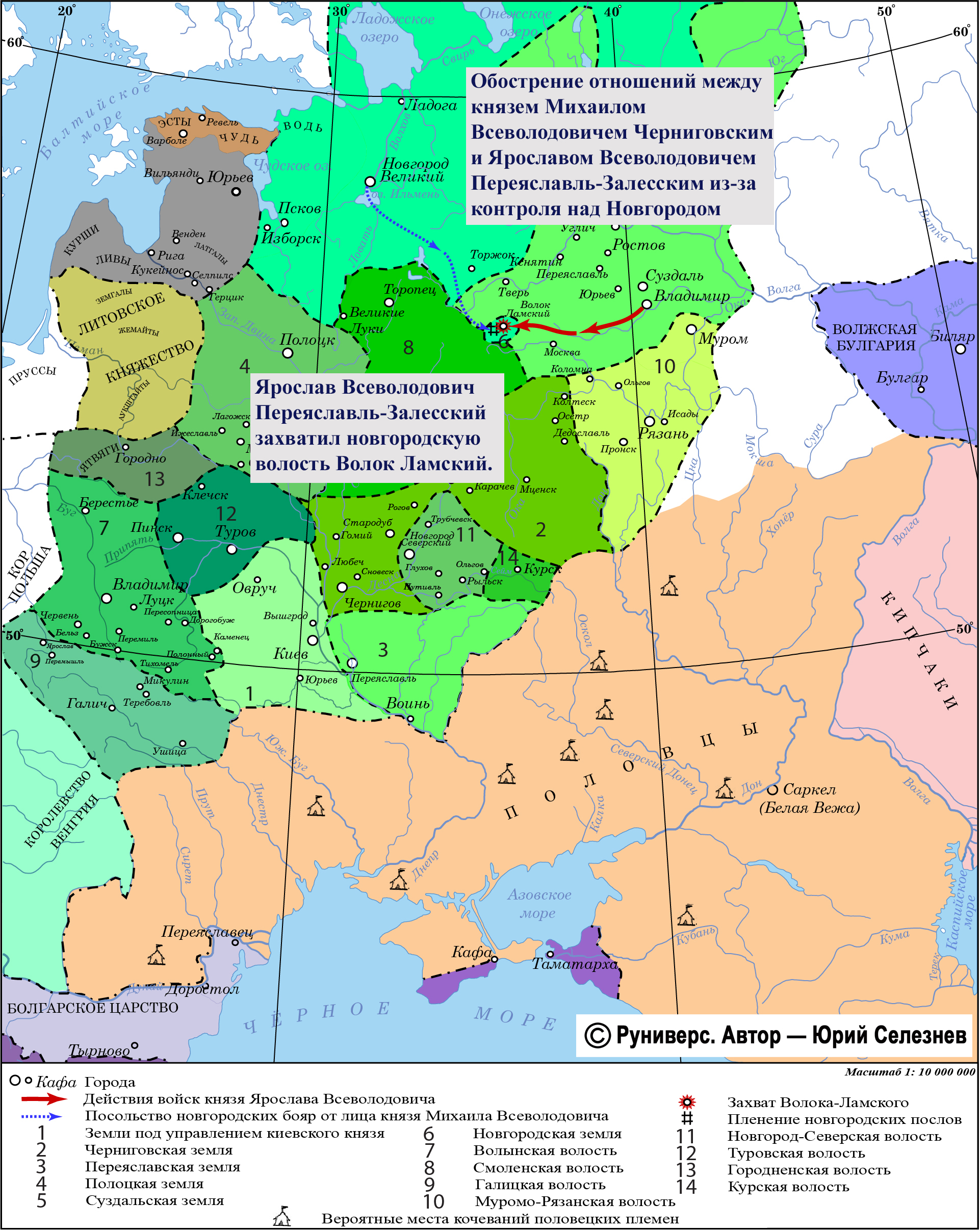 Обострились отношения между князем Михаилом Всеволодовичем Черниговским и Ярославом Всеволодовичем Переяславль-Залесским из-за контроля над Новгородом. Когда князь Михаил Всеволодович уехал в Чернигов улаживать дела в Южной Руси, оставив в Новгороде сына Ростислава, князь Ярослав Всеволодович захватил новгородскую волость Волок Ламский.