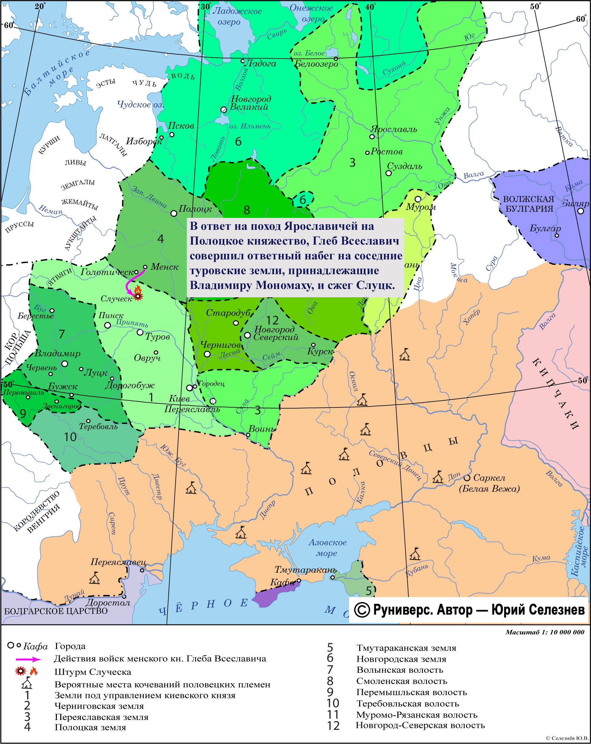 В ответ на поход Ярославичей на Полоцкое княжество, Глеб Всеславич совершил ответный набег на соседние туровские земли, принадлежащие Владимиру Мономаху, и сжег Слуцк.