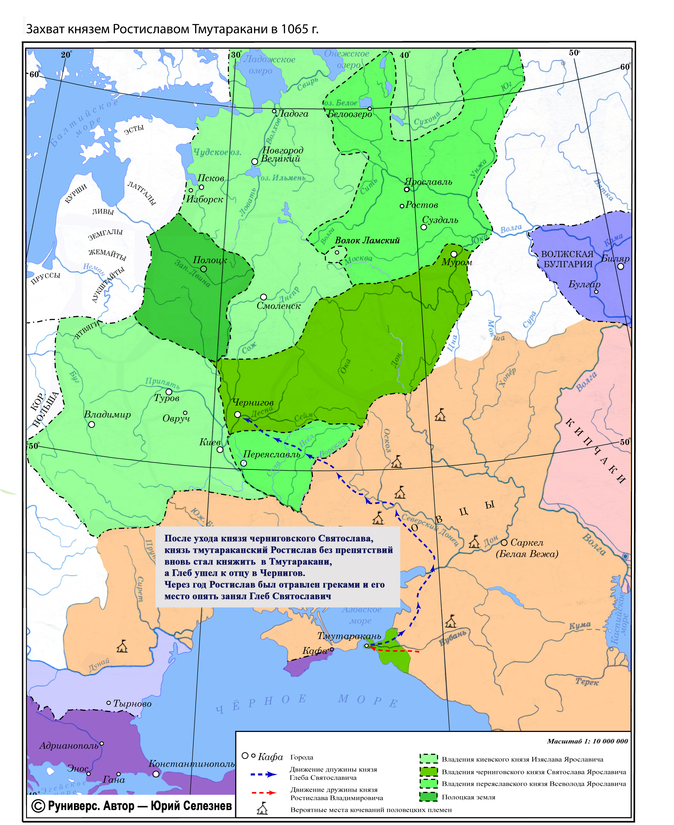 После ухода князя черниговского Святослава, князь тмутараканский Ростислав без препятствий вновь стал княжить в Тмутаракани, а Глеб ушел к отцу в Чернигов. Через год Ростислав был отравлен греками и его место опять занял Глеб Святославич