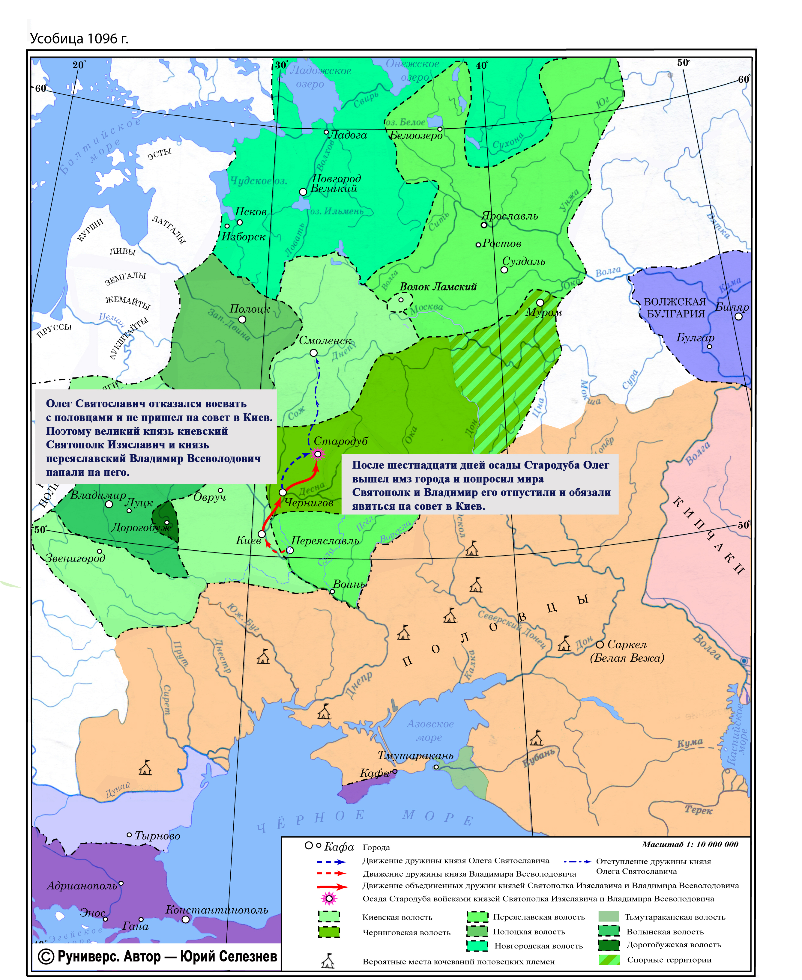 Олег Святославич отказался воевать с половцами и не пришел на совет в Киев. Поэтому великий князь киевский Святополк Изяславич и князь переяславский Владимир Всеволодович напали на него.После шестнадцати дней осады Стародуба Олег вышел из города и попросил мира. Святополк и Владимир его отпустили и обязали явиться на совет в Киев.