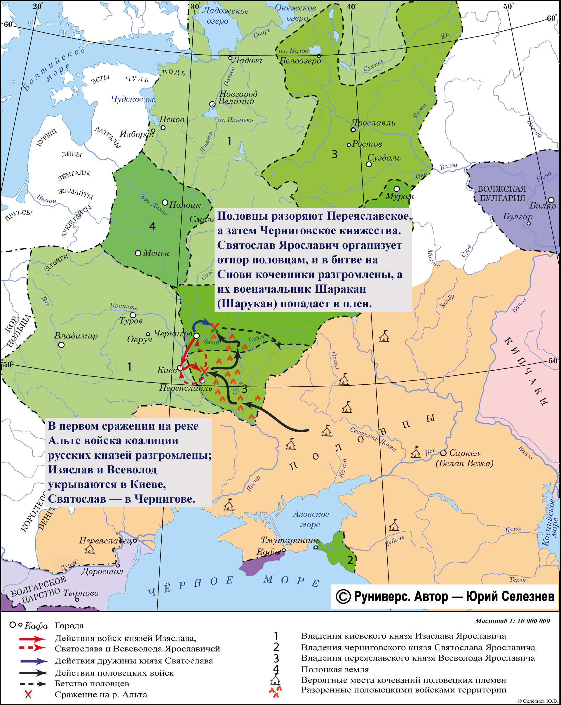 В первом сражении на реке Альте войска коалиции русских князей разгромлены; Изяслав и Всеволод