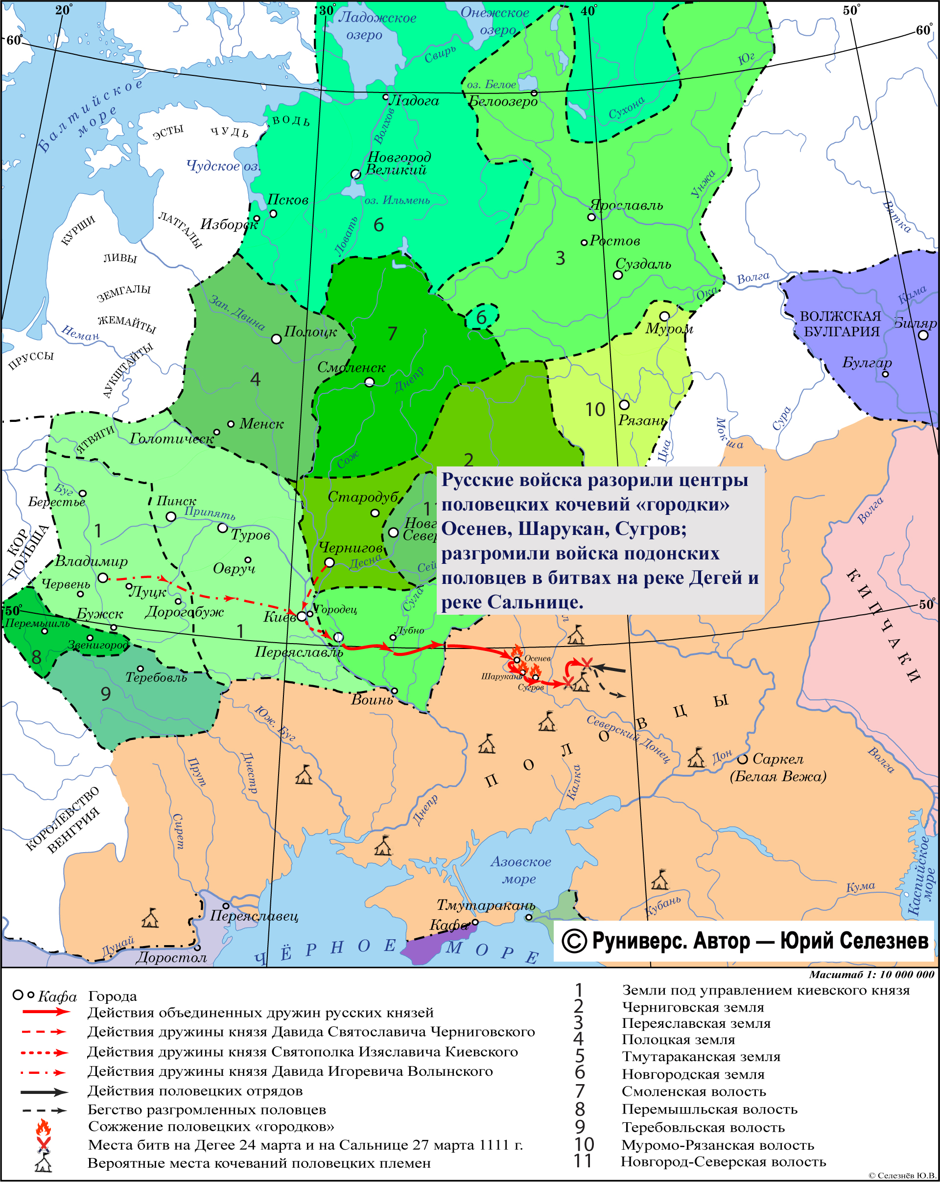 Русские войска разорили центры половецких кочевий «городки» Осенев, Шарукан, Сугров; разгромили