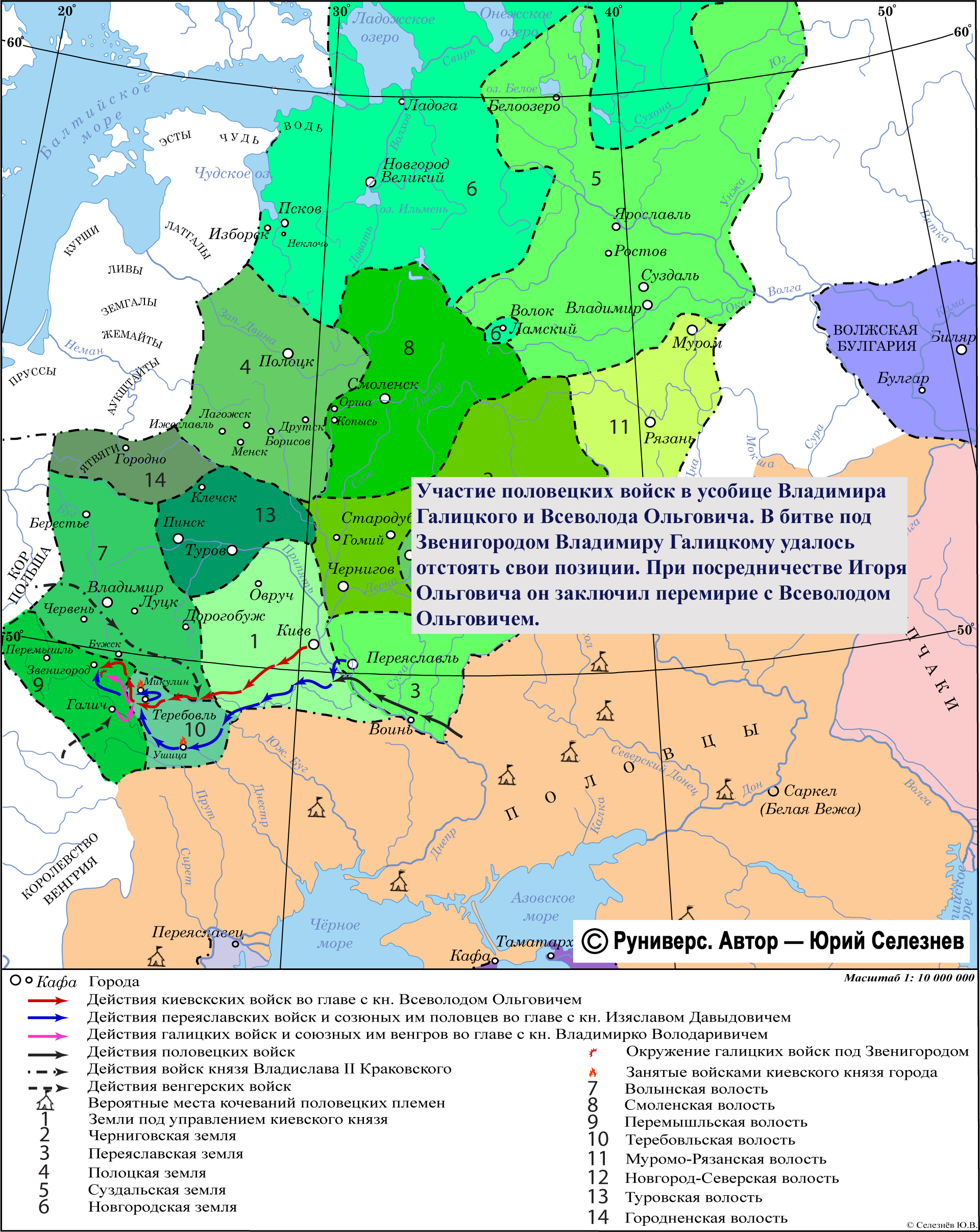Участие половецких войск в усобице Владимира Галицкого и Всеволода Ольговича. В битве под Звенигородом Владимиру Галицкому удалось отстоять свои позиции. При посредничестве Игоря Ольговича он заключил перемирие с Всеволодом Ольговичем.