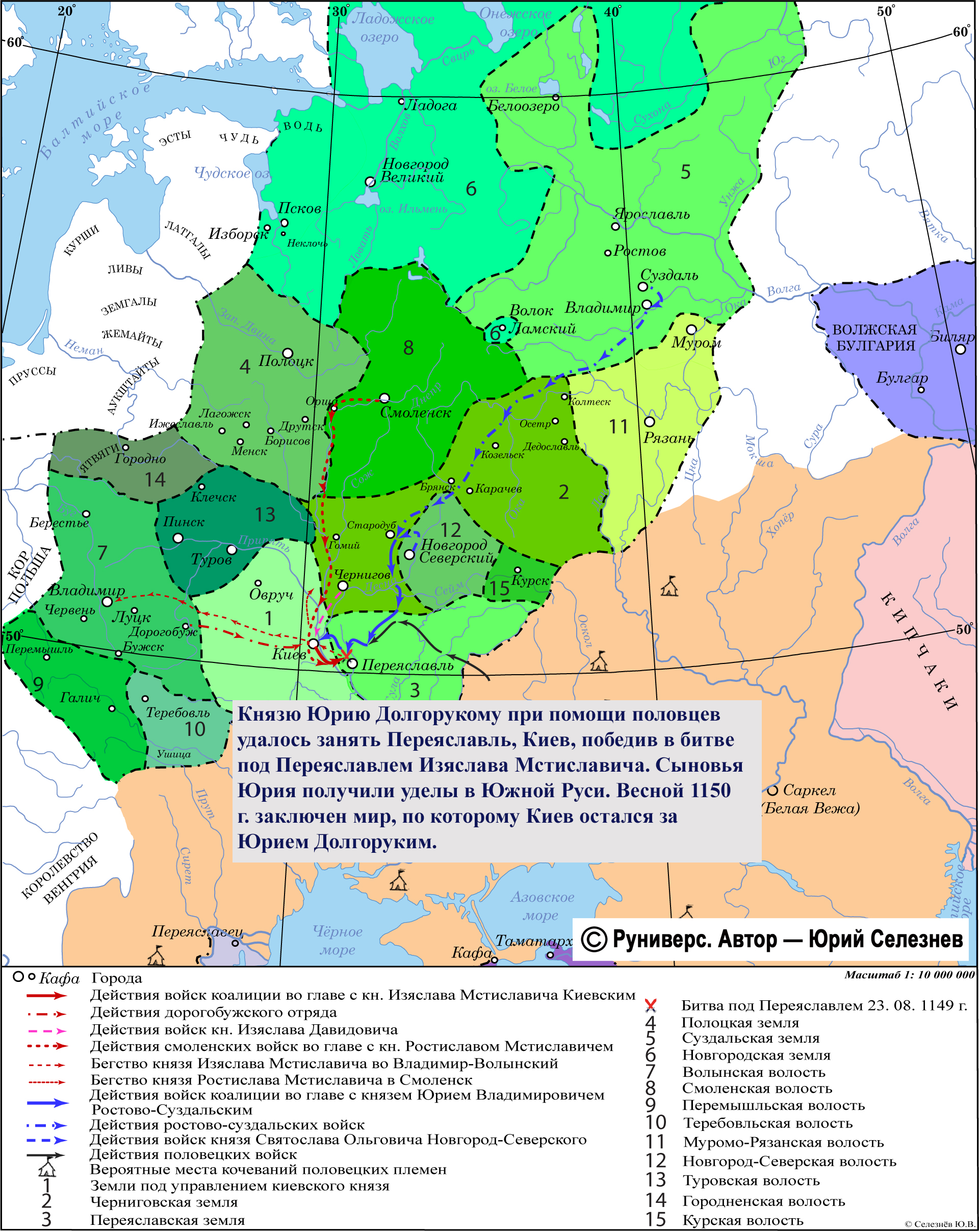 Князю Юрию Долгорукому при помощи половцев удалось занять Переяславль, Киев, победив в битве под Переяславлем Изяслава Мстиславича. Сыновья Юрия получили уделы в Южной Руси. Весной 1150 г. заключен мир, по которому Киев остался за Юрием Долгоруким.