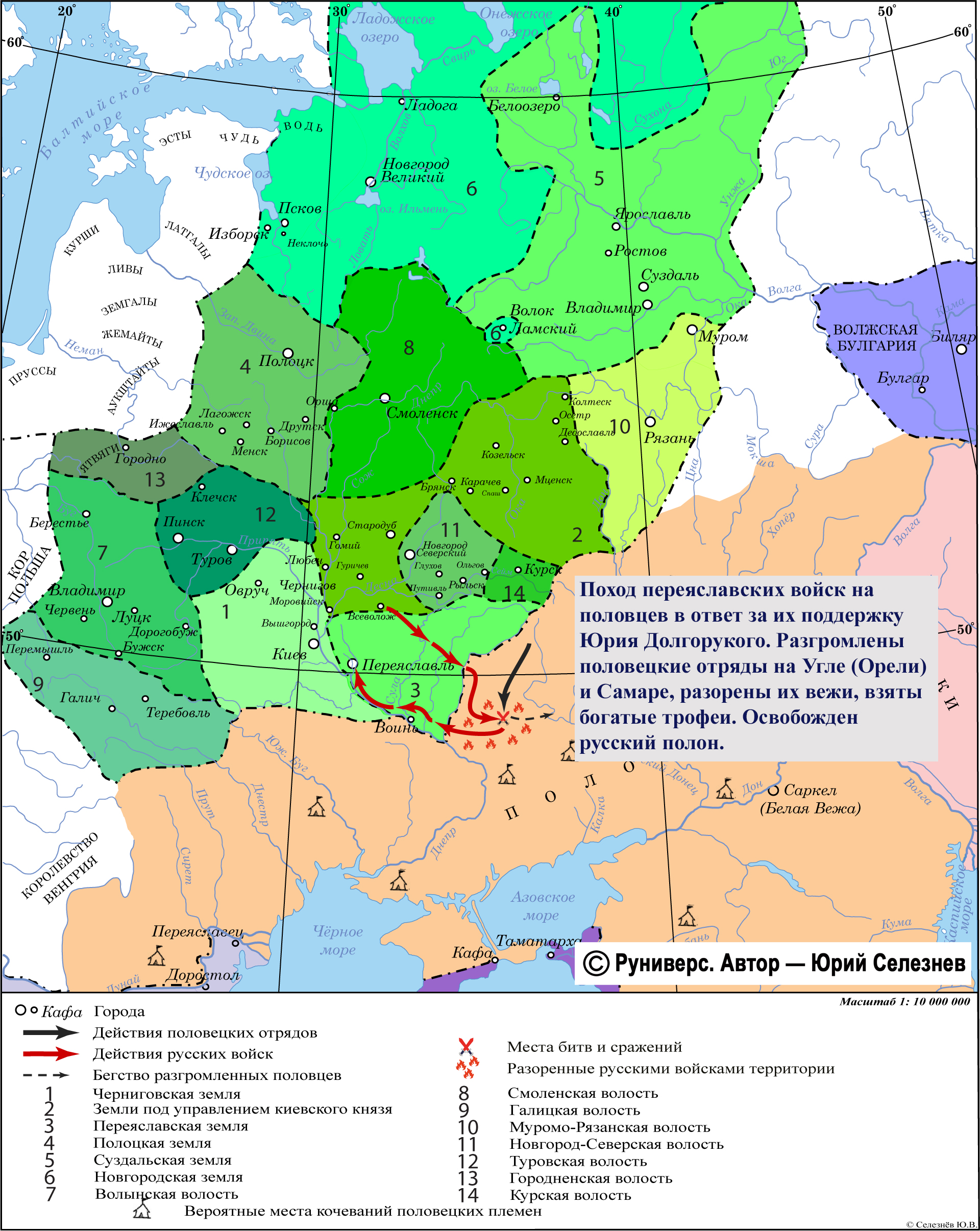 Поход переяславских войск на половцев в ответ за их поддержку Юрия Долгорукого. Разгромлены половецкие отряды на Угле (Орели) и Самаре, разорены их вежи, взяты богатые трофеи. Освобожден русский полон.