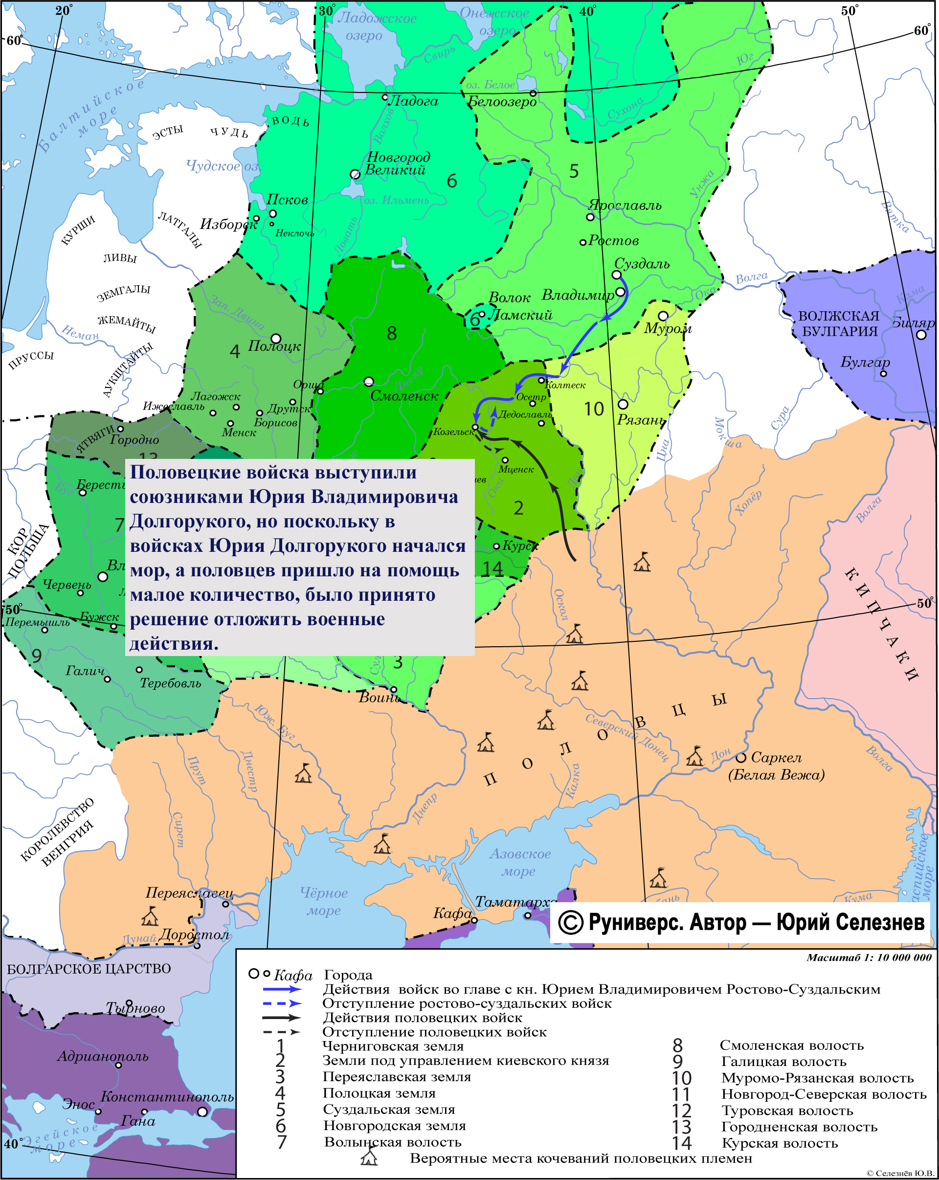 Половецкие войска выступили союзниками Юрия Владимировича Долгорукого, но поскольку в войсках Юрия Долгорукого начался мор, а половцев пришло на помощь малое количество, было принято решение отложить военные действия.