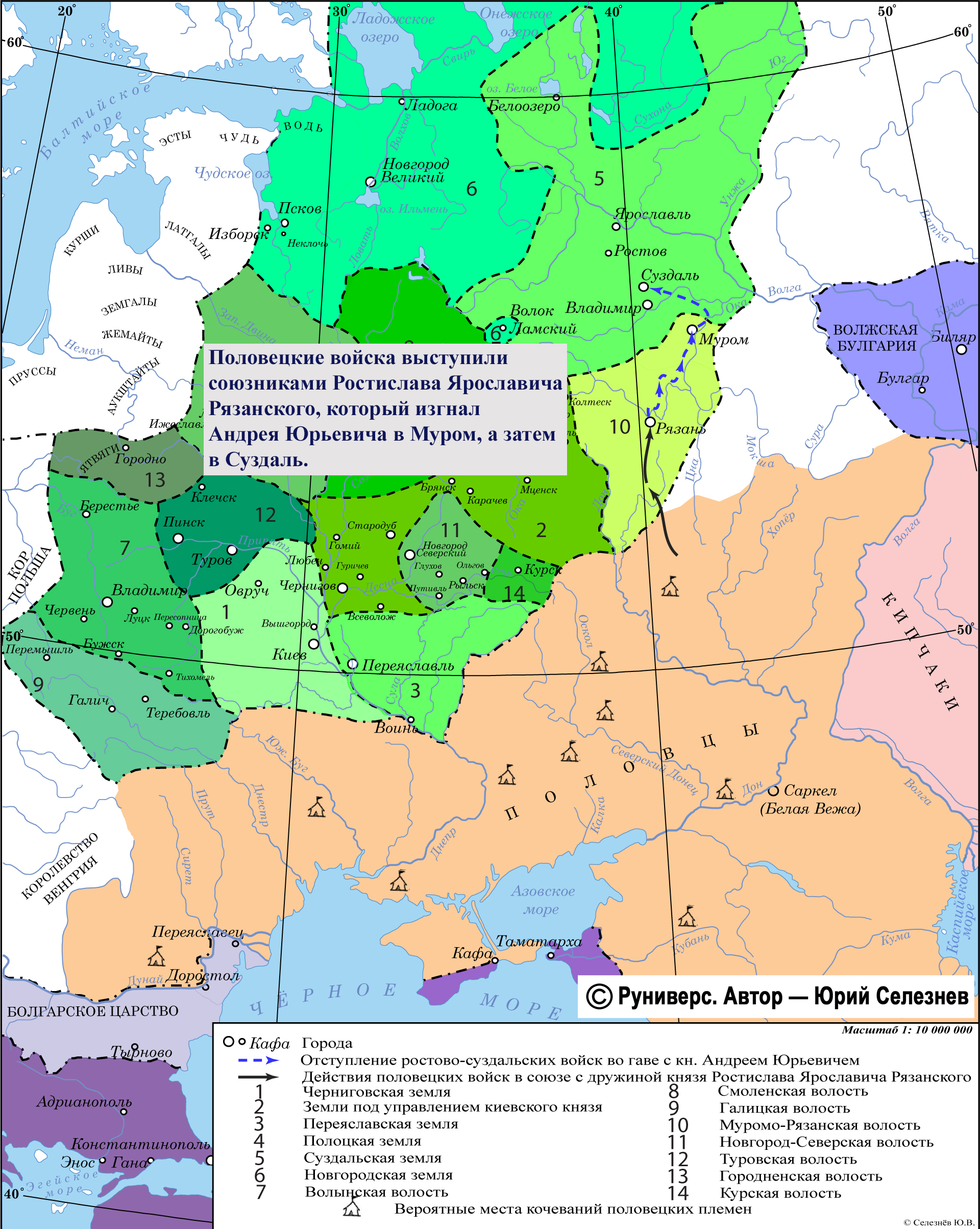 Половецкие войска выступили союзниками Ростислава Ярославича Рязанского, который изгнал Андрея Юрьевича в Муром, а затем в Суздаль.