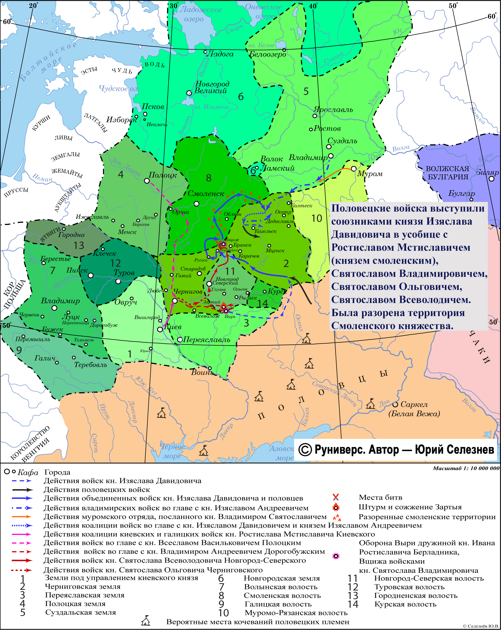 Половецкие войска выступили союзниками князя Изяслава Давидовича в усобице с Ростиславом Мстиславичем (князем смоленским), Святославом Владимировичем, Святославом Ольговичем, Святославом Всеволодичем. Была разорена территория Смоленского княжества.