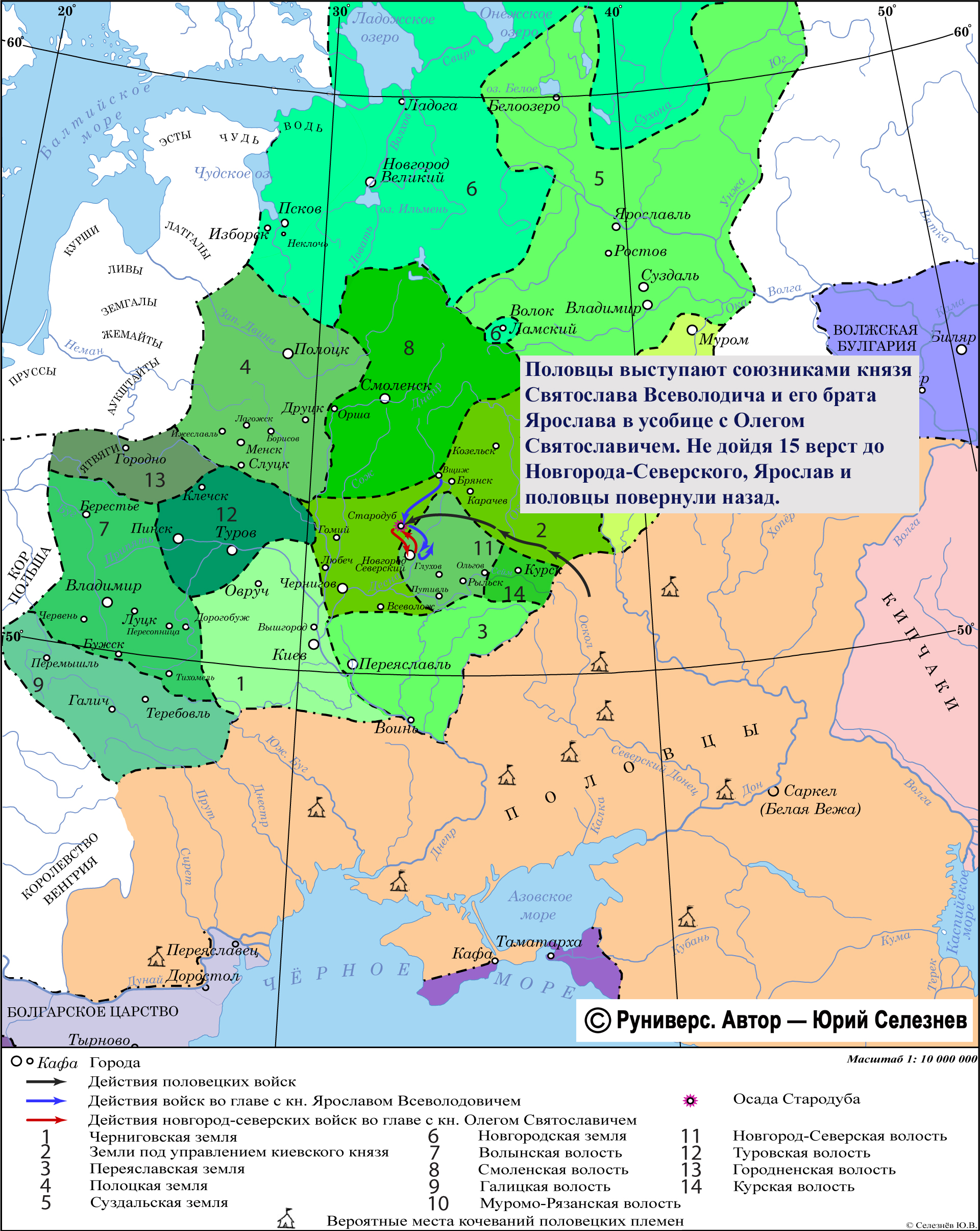 Половцы выступают союзниками князя Святослава Всеволодича и его брата Ярослава в усобице с Олегом Святославичем. Не дойдя 15 верст до Новгорода-Северского, Ярослав и половцы повернули назад.