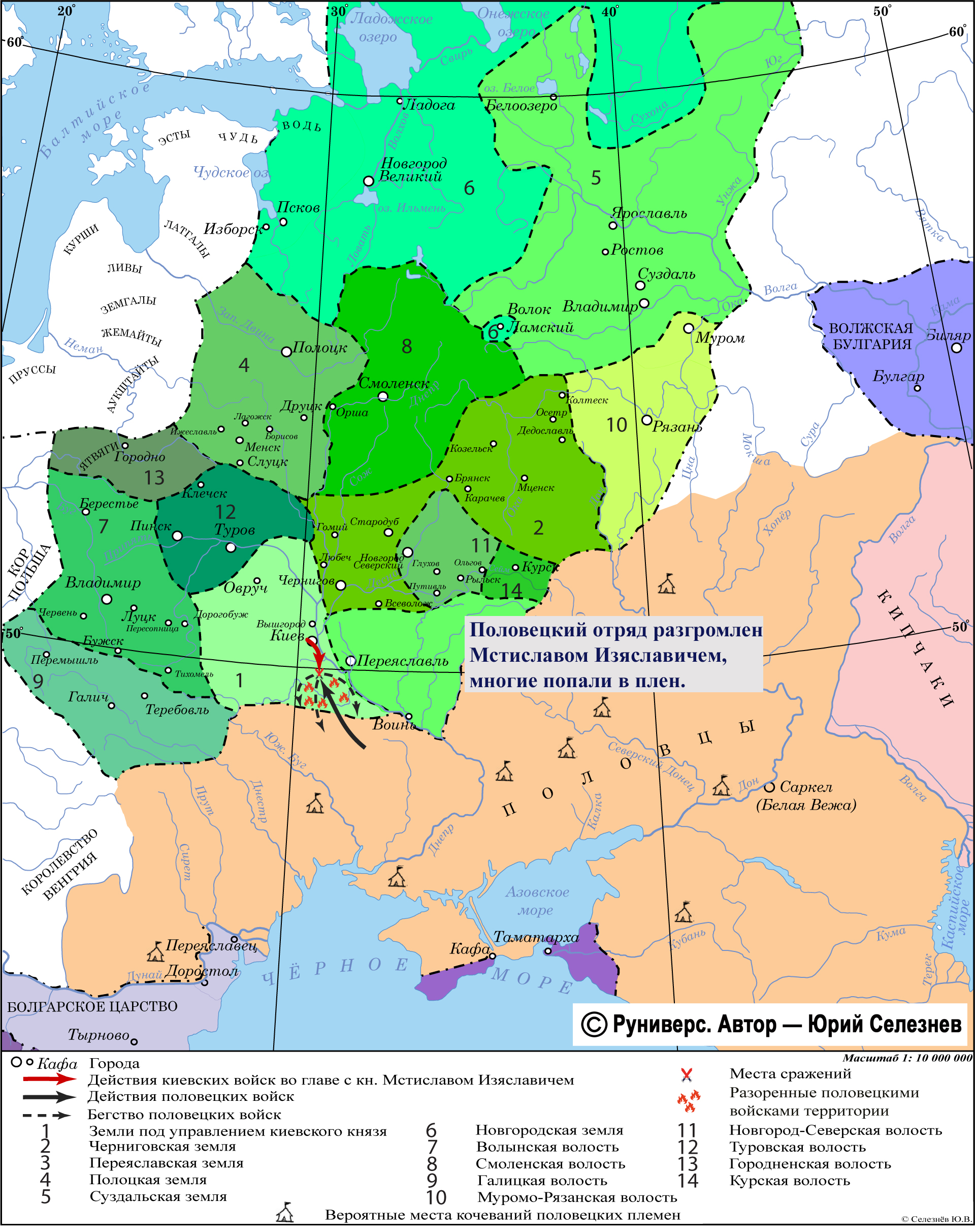 Половецкий отряд разгромлен Мстиславом Изяславичем, многие попали в плен.