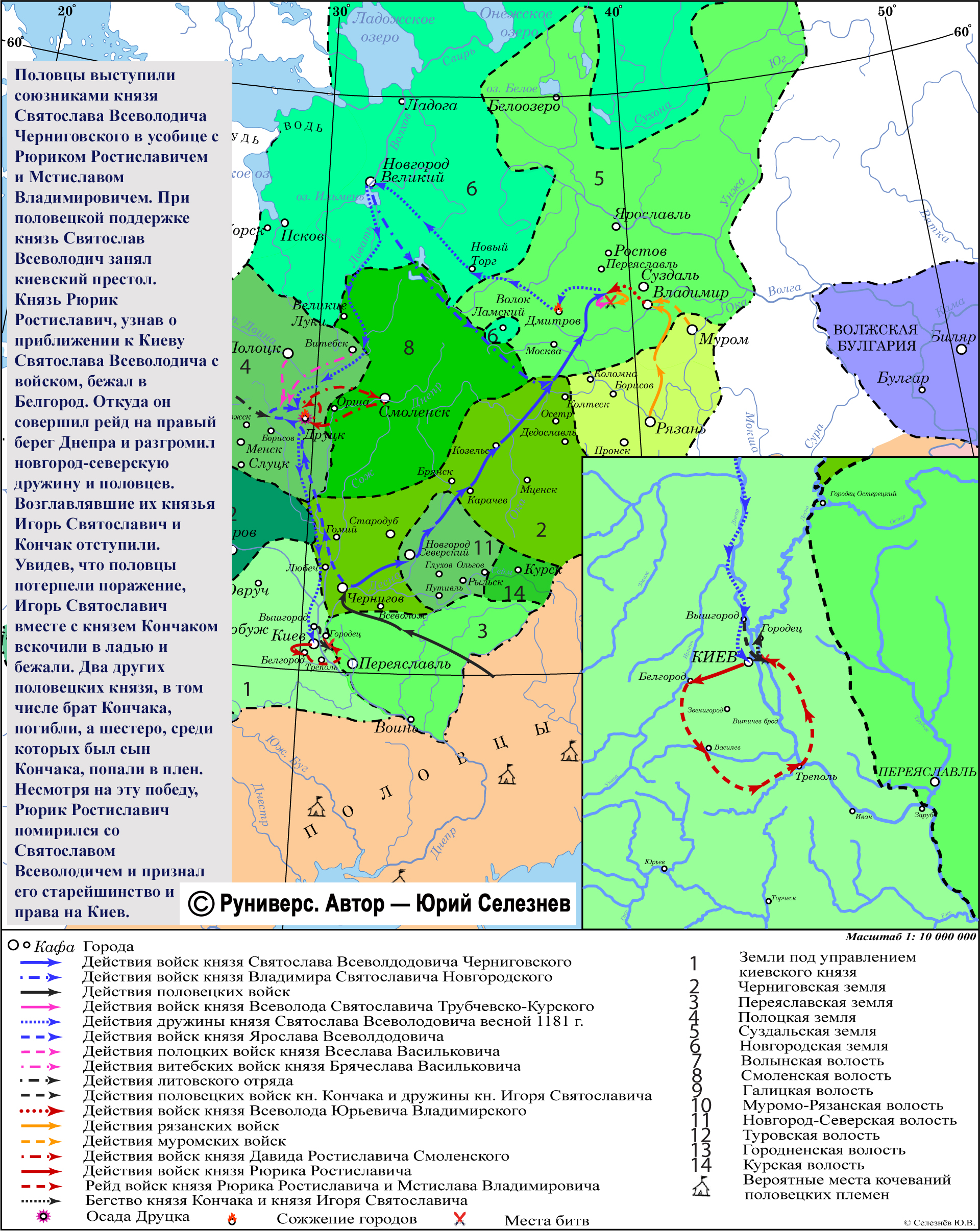 Половцы выступили союзниками князя Святослава Всеволодича Черниговского в усобице с князем Всеволодом Юрьевичем. Разделив свои войска (часть осталась в Чернигове с его братом Ярославом и князем Игорем Святославичем, а также часть половецких войск, вероятно, возглавляемая князем Кончаком), черниговский князь выдвинулся к границам Суздальской земли. Сюда же подошла новгородская рать во главе с его сыном Владимиром. На реке Влене путь черниговским войскам преградила рать князя Всеволода Юрьевича Суздальского, которая была усилена муромскими и рязанскими полками. В ходе позиционных боев победитель не был выявлен.