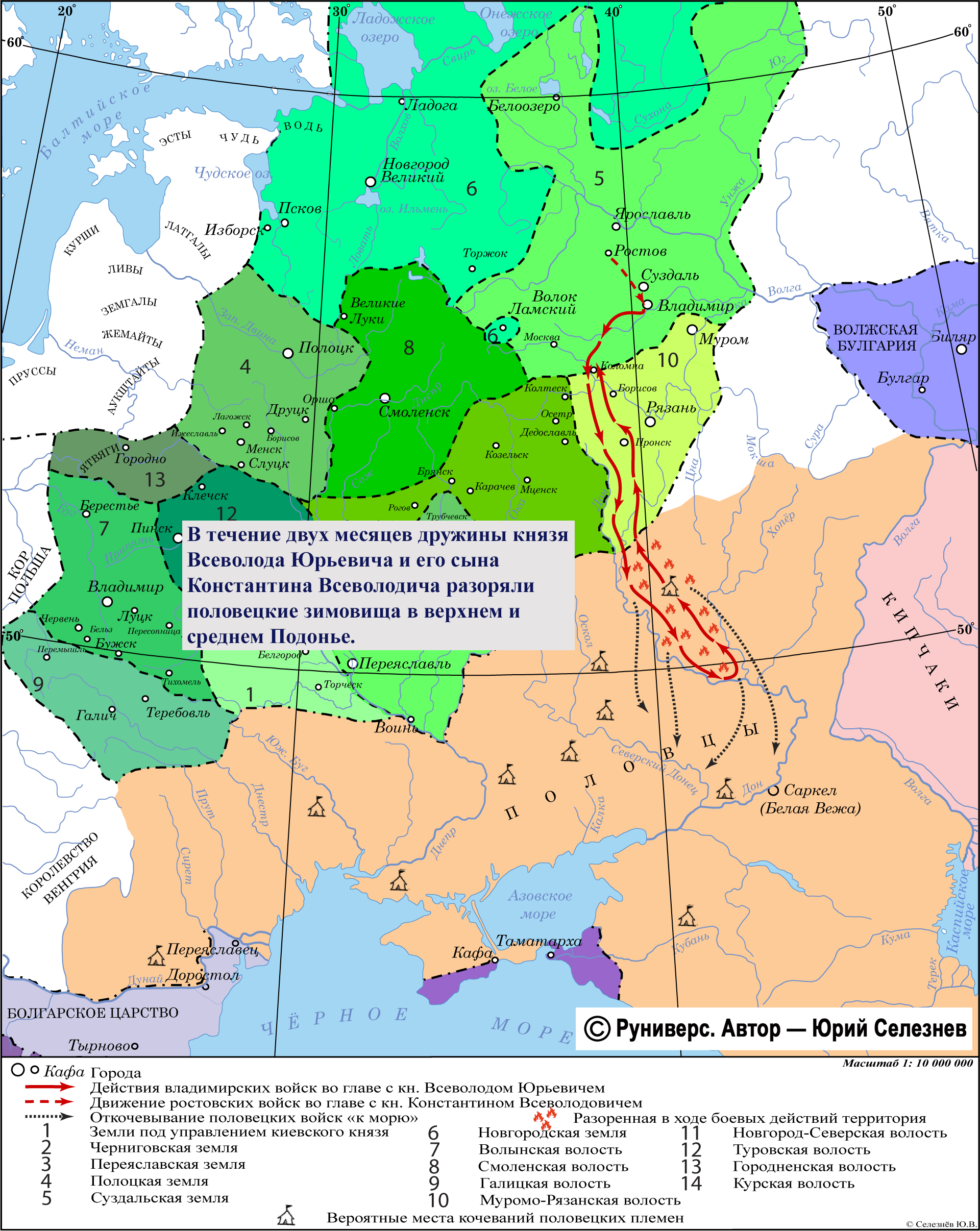 В течение двух месяцев дружины князя Всеволода Юрьевича и его сына Константина Всеволодича разоряли половецкие зимовища в верхнем и среднем Подонье.