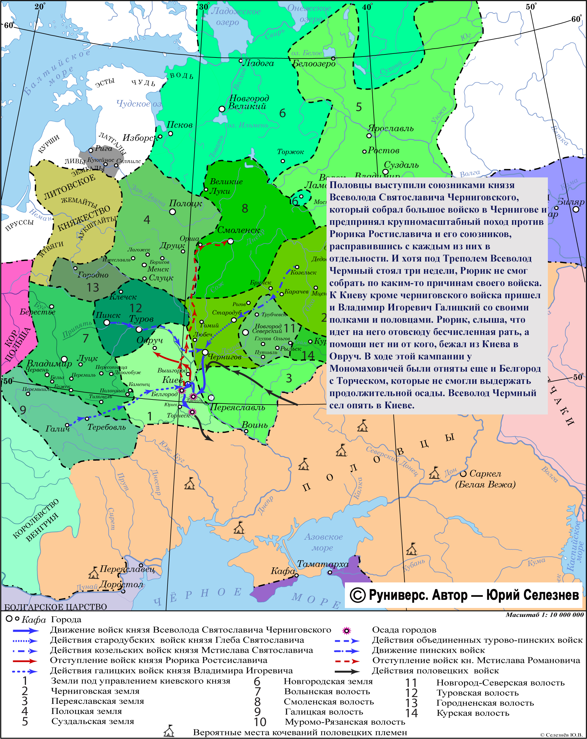 Половцы выступили союзниками князя Всеволода Святославича Черниговского, который собрал большое войско в Чернигове и предпринял крупномасштабный поход против Рюрика Ростиславича и его союзников, расправившись с каждым из них в отдельности. И хотя под Треполем Всеволод Чермный стоял три недели, Рюрик не смог собрать по каким-то причинам своего войска. К Киеву кроме черниговского войска пришел и Владимир Игоревич Галицкий со своими полками и половцами.