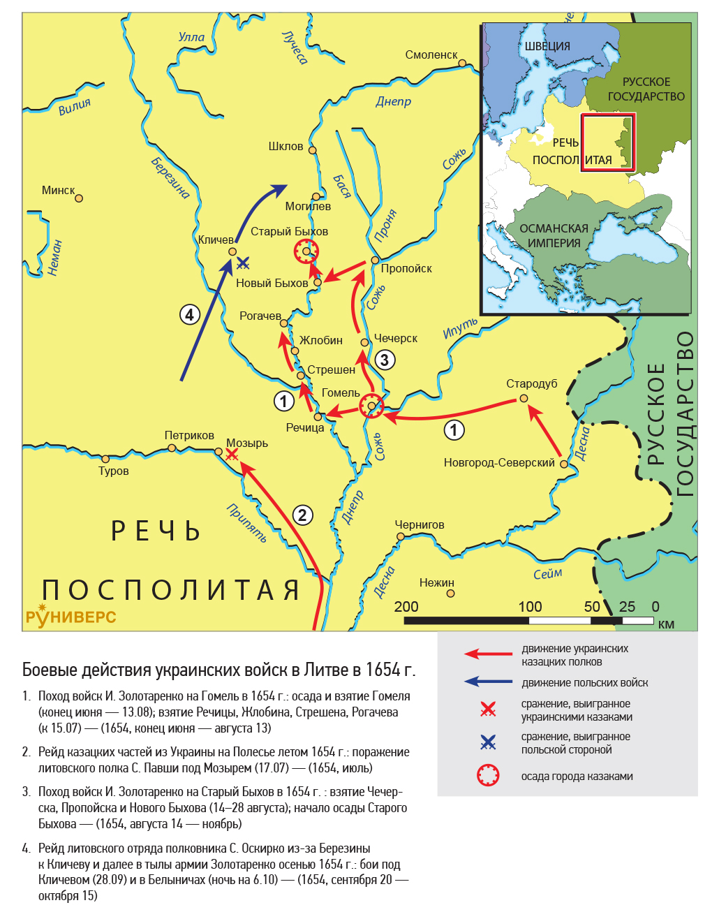 1. Поход войск И. Золотаренко на Гомель в 1654 г.: осада и взятие Гомеля (конец июня — 13.08); взятие Речицы, Жлобина, Стрешена, Рогачева (к 15.07) — (1654, конец июня — августа 13)