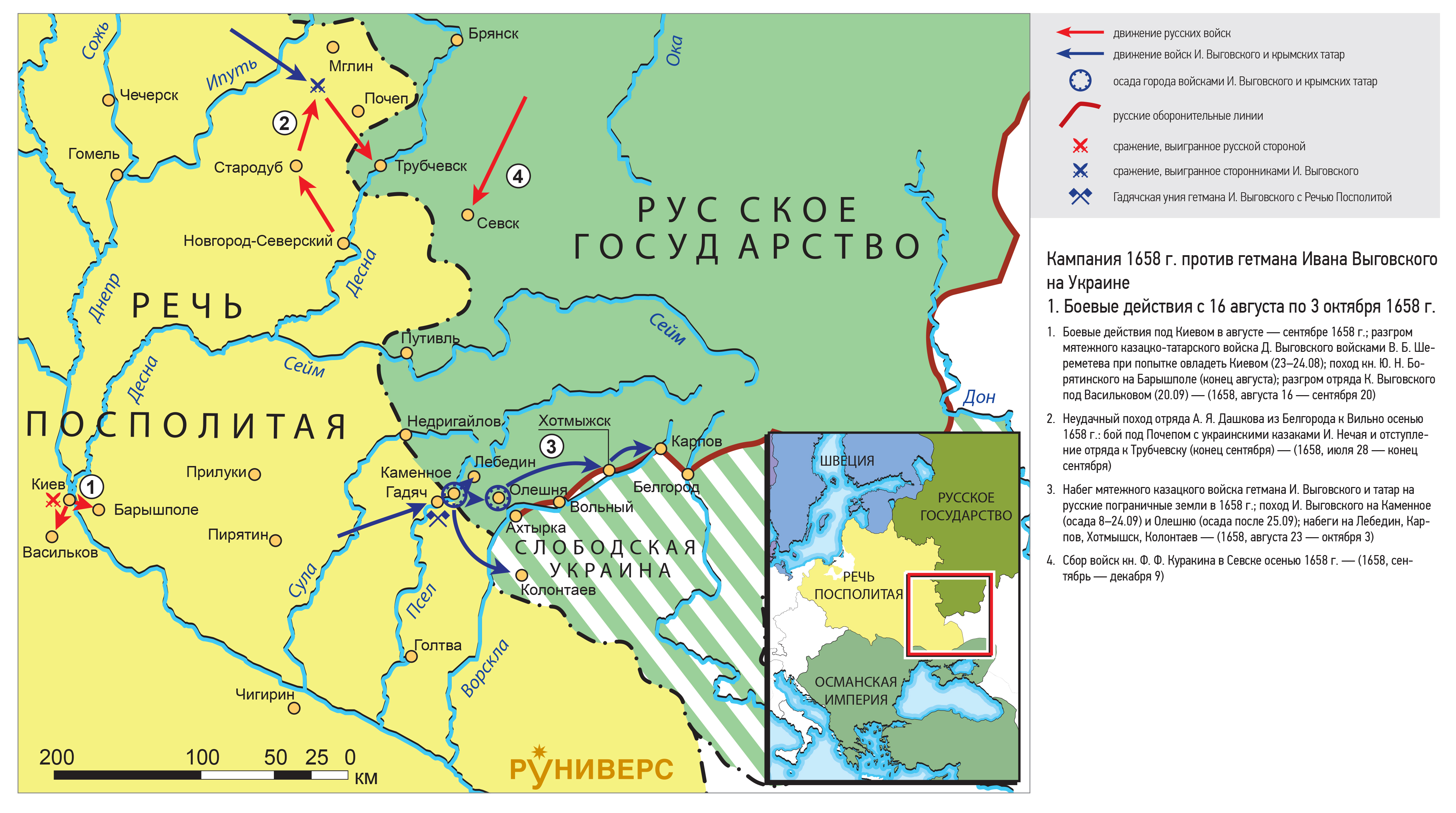 3. Набег мятежного казацкого войска гетмана И. Выговского и татар на русские пограничные земли в 1658 г.; поход И. Выговского на Каменное (осада 8–24.09) и Олешню (осада после 25.09); набеги на Лебедин, Карпов, Хотмышск, Колонтаев — (1658, августа 23 — октября 3)