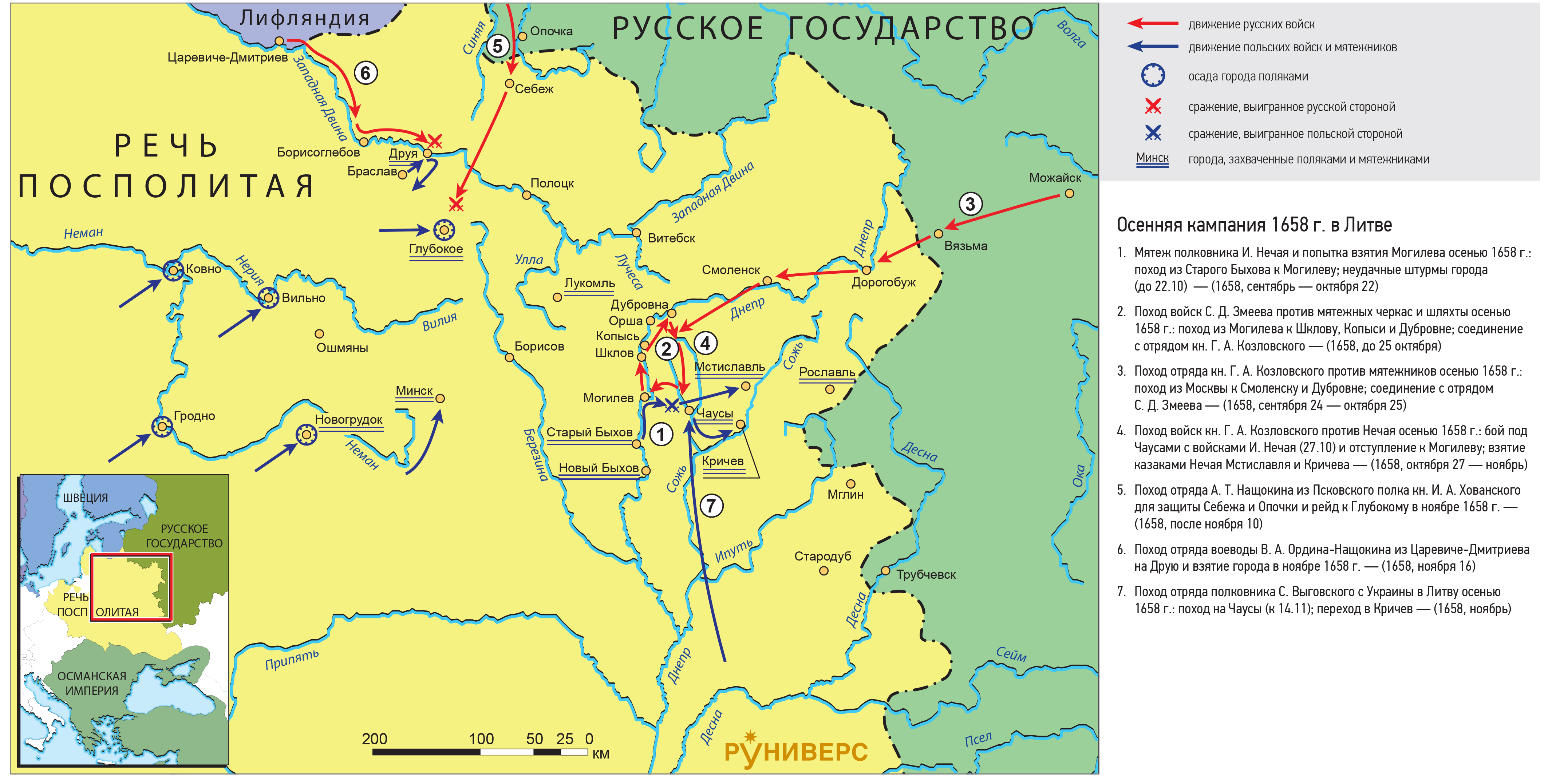 7. Поход отряда полковника С. Выговского с Украины в Литву осенью 1658 г.: поход на Чаусы (к 14.11); переход в Кричев — (1658, ноябрь)