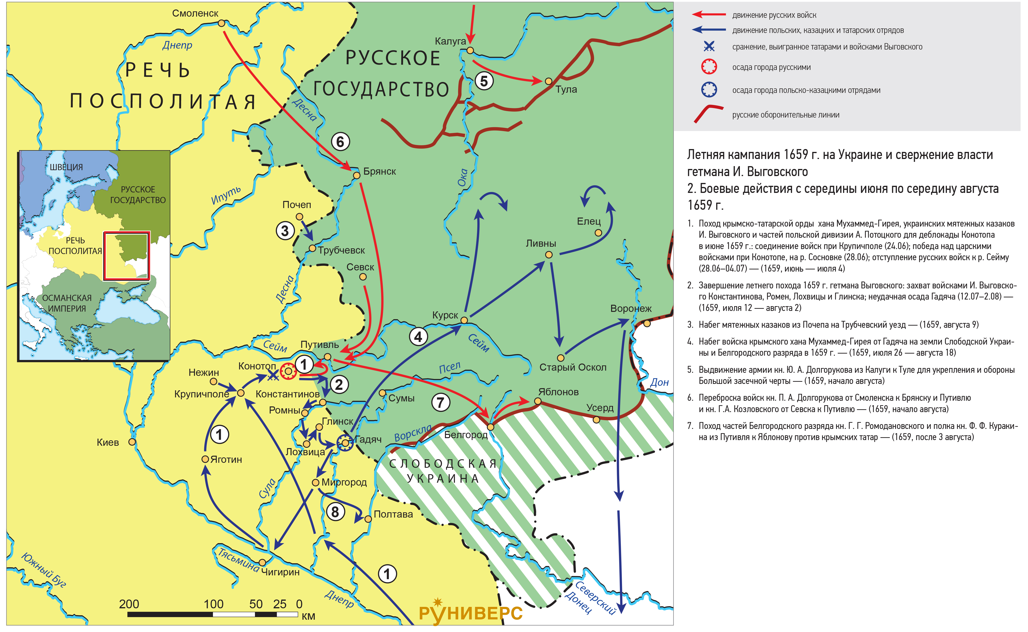 1. Поход крымско-татарской орды хана Мухаммед-Гирея, украинских мятежных казаков И. Выговского и частей польской дивизии А. Потоцкого для деблокады Конотопа в июне 1659 г.: соединение войск при Крупичполе (24.06); победа над царскими войсками при Конотопе, на р. Сосновке (28.06); отступление русских войск к р. Сейму (28.06–04.07) — (1659, июнь — июля 4)
