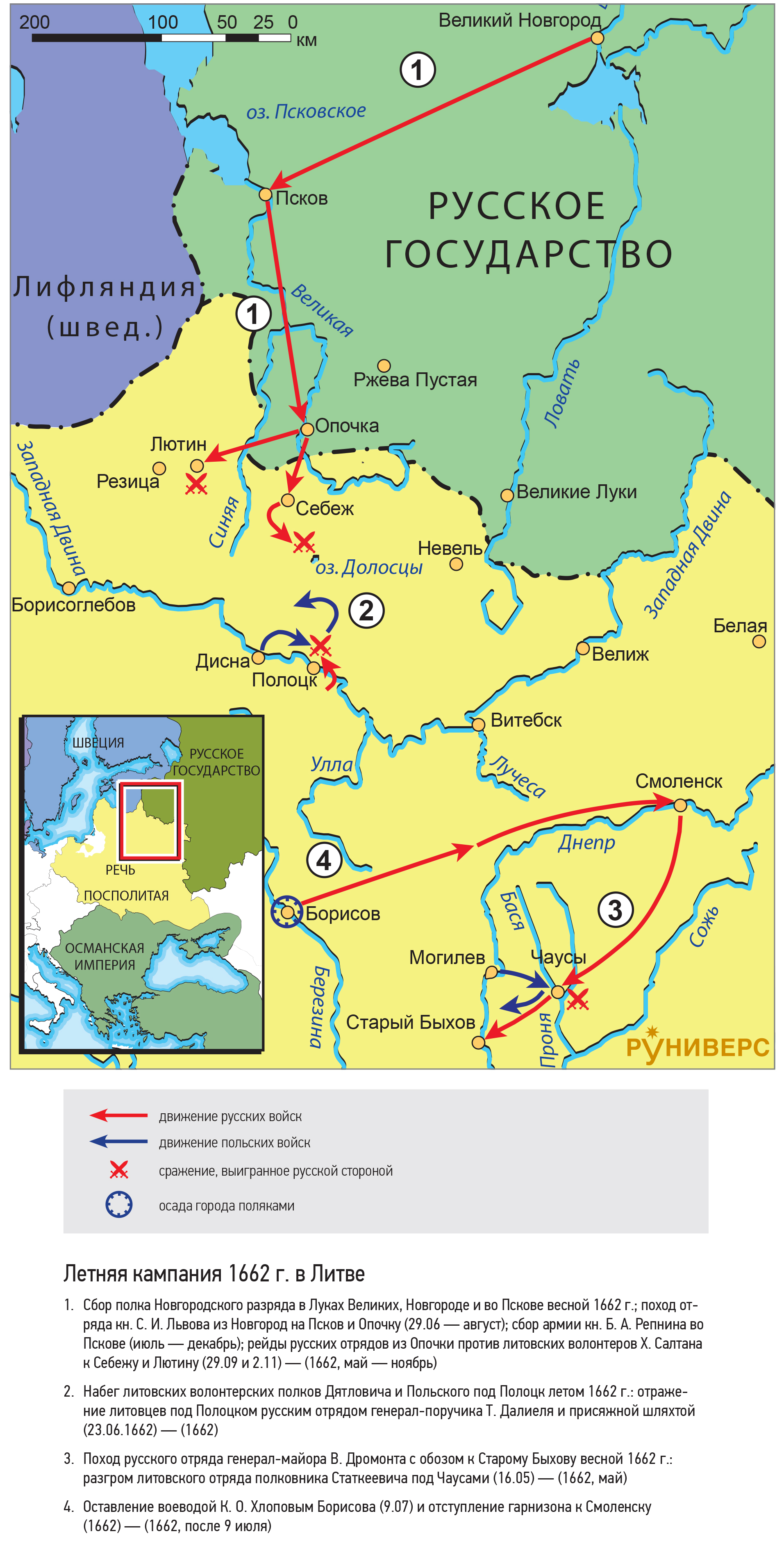1. Сбор полка Новгородского разряда в Луках Великих, Новгороде и во Пскове весной 1662 г.; поход отряда кн. С. И. Львова из Новгород на Псков и Опочку (29.06 — август); сбор армии кн. Б. А. Репнина во Пскове (июль — декабрь); рейды русских отрядов из Опочки против литовских волонтеров Х. Салтана к Себежу и Лютину (29.09 и 2.11) — (1662, май — ноябрь)