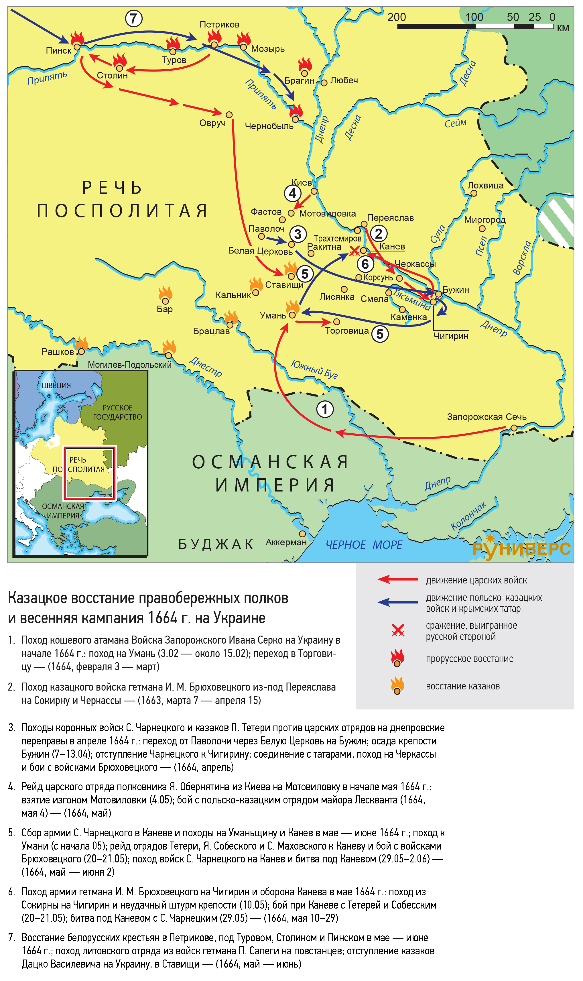 3. Походы коронных войск С. Чарнецкого и казаков П. Тетери против царских отрядов на днепровские переправы в апреле 1664 г.: переход от Паволочи через Белую Церковь на Бужин; осада крепости Бужин (7–13.04); отступление Чарнецкого к Чигирину; соединение с татарами, поход на Черкассы и бои с войсками Брюховецкого — (1664, апрель)