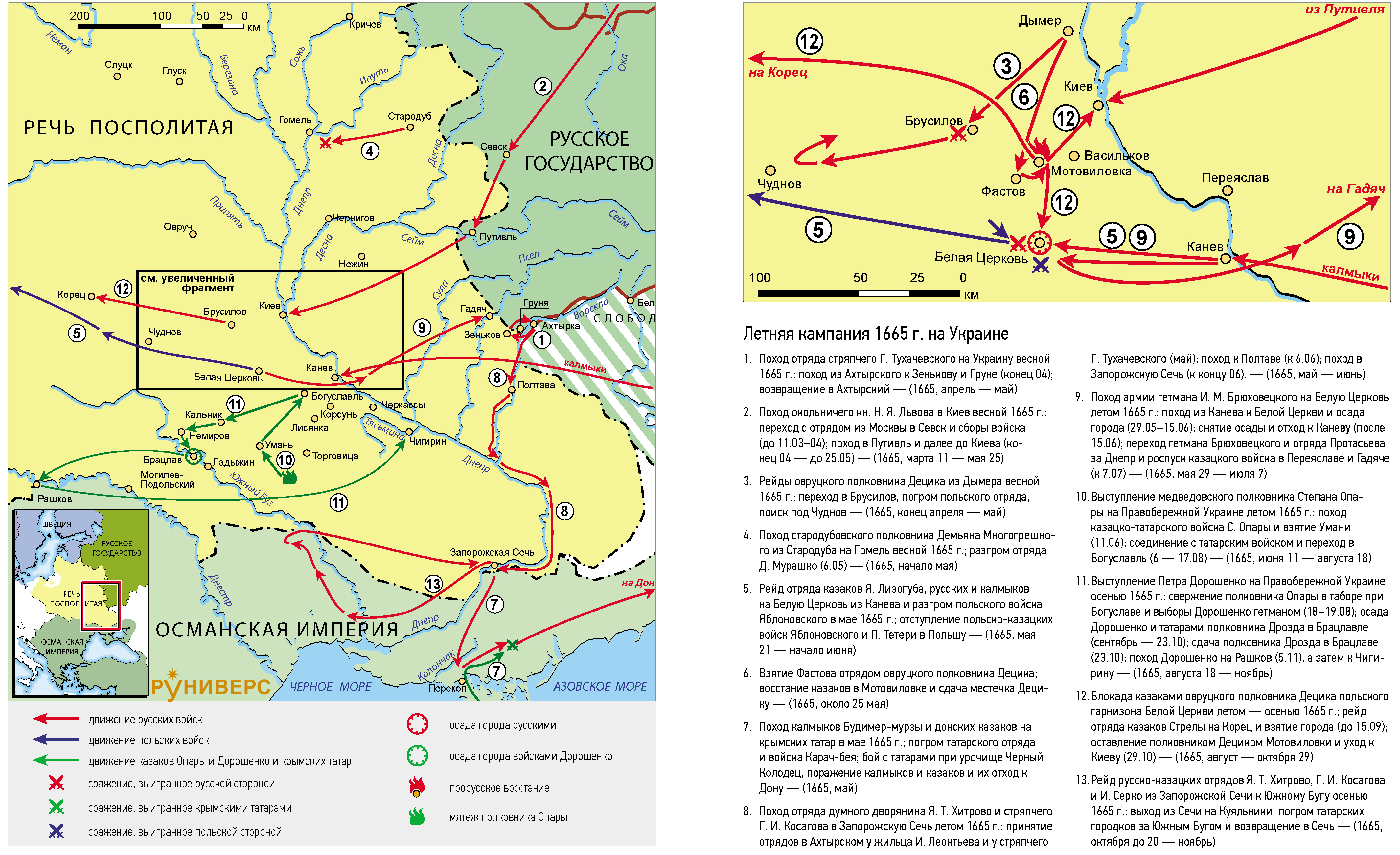 11. Выступление Петра Дорошенко на Правобережной Украине осенью 1665 г.: свержение полковника Опары в таборе при Богуславе и выборы Дорошенко гетманом (18–19.08); осада Дорошенко и татарами полковника Дрозда в Брацлавле (сентябрь — 23.10); сдача полковника Дрозда в Брацлаве (23.10); поход Дорошенко на Рашков (5.11), а затем к Чигирину — (1665, августа 18 — ноябрь)