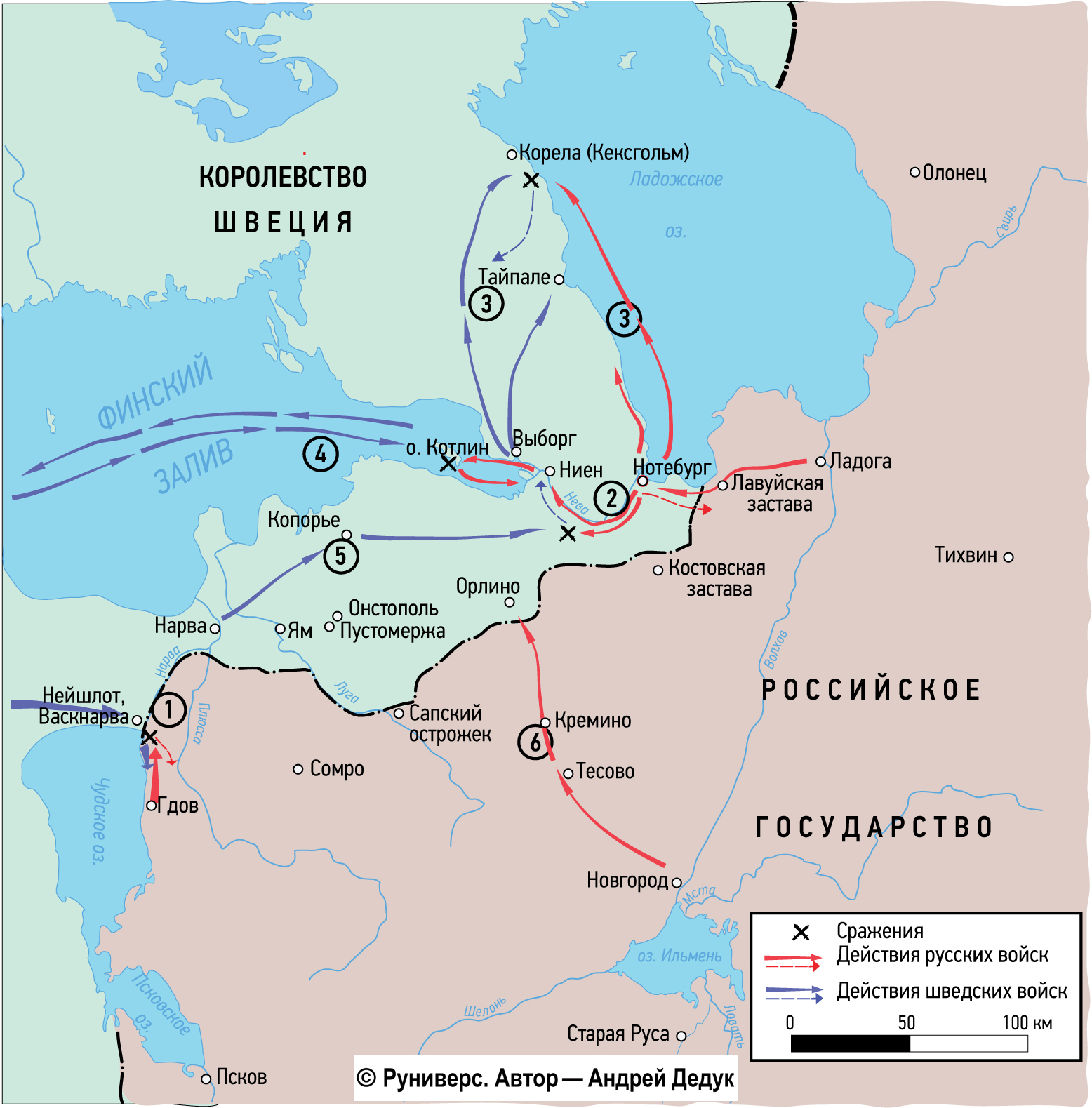 2. Поход русского войска воеводы П.С. Потемкина в Ижорскую землю в 1656 г.: взятие города Ниена (06.06); осада Нотебурга (04.06–17.11); морской бой у о. Котлин (22.07); отступление русского войска к Ладоге (конец ноября) — (1656, июня 3 — ноябрь).