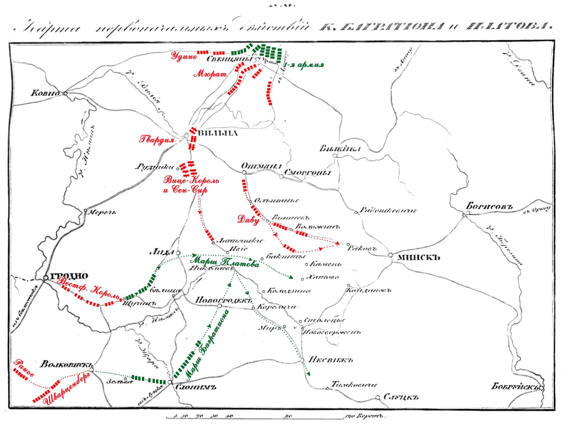 Карта первоначальных действий К. Багратиона и Платова.