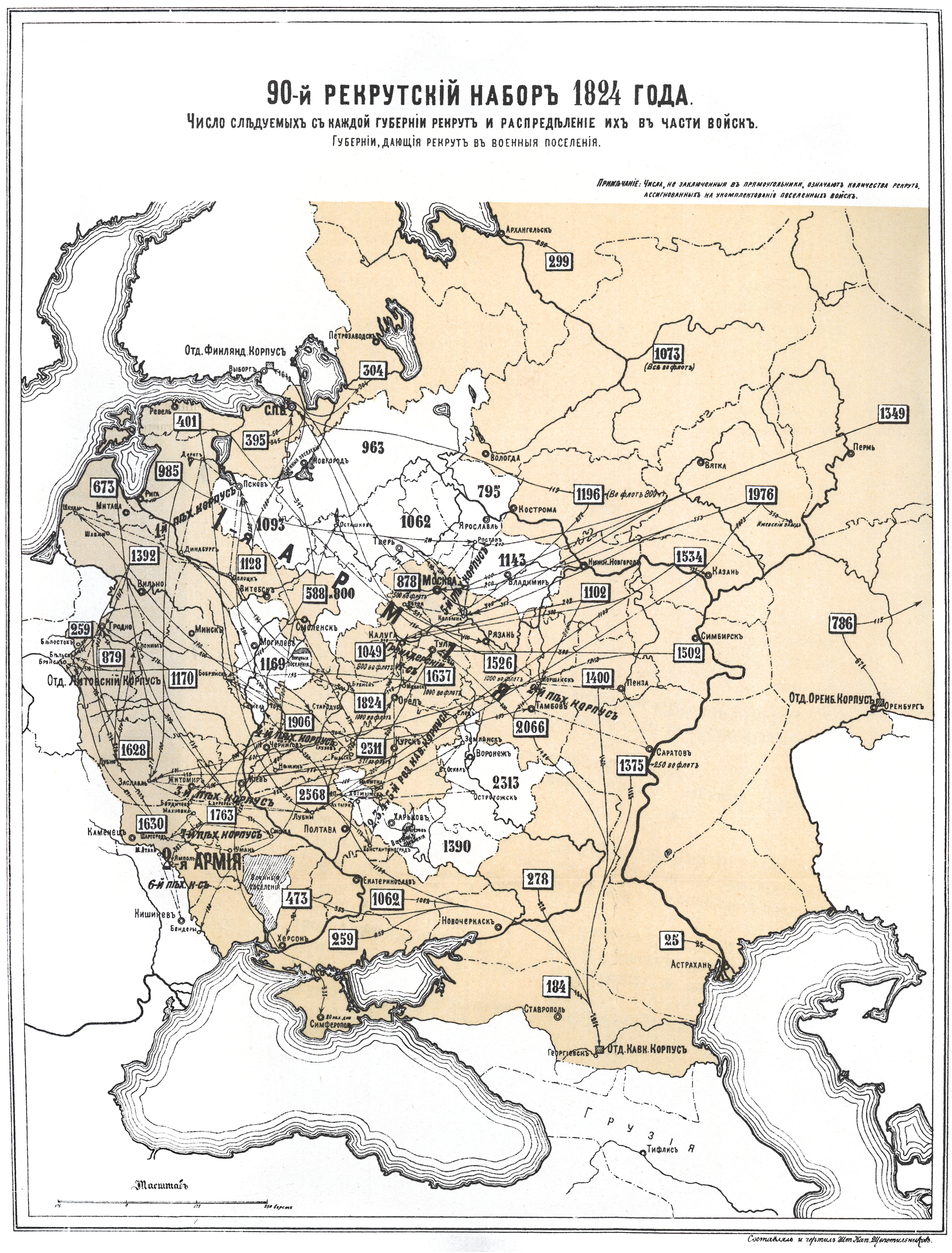 90 рекрутский набор 1824 года. Число следуемых с каждой губернии рекрут и распределение их в части войск. Губернии, дающие рекрут в военные поселения
