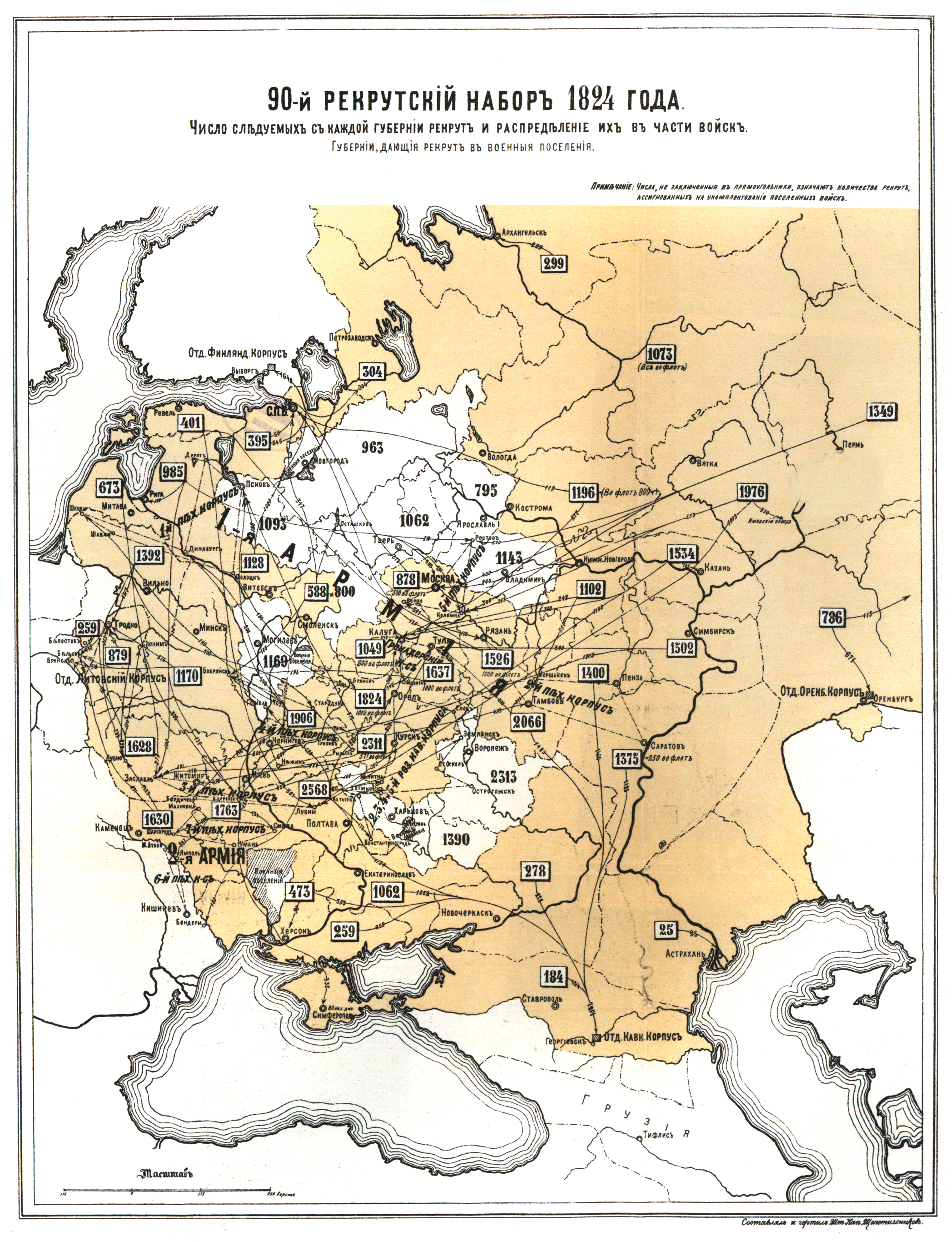 90 рекрутский набор 1824 года. Число следуемых с каждой губернии рекрут и распределение их в части войск. Губернии, дающие рекрут в военные поселения
