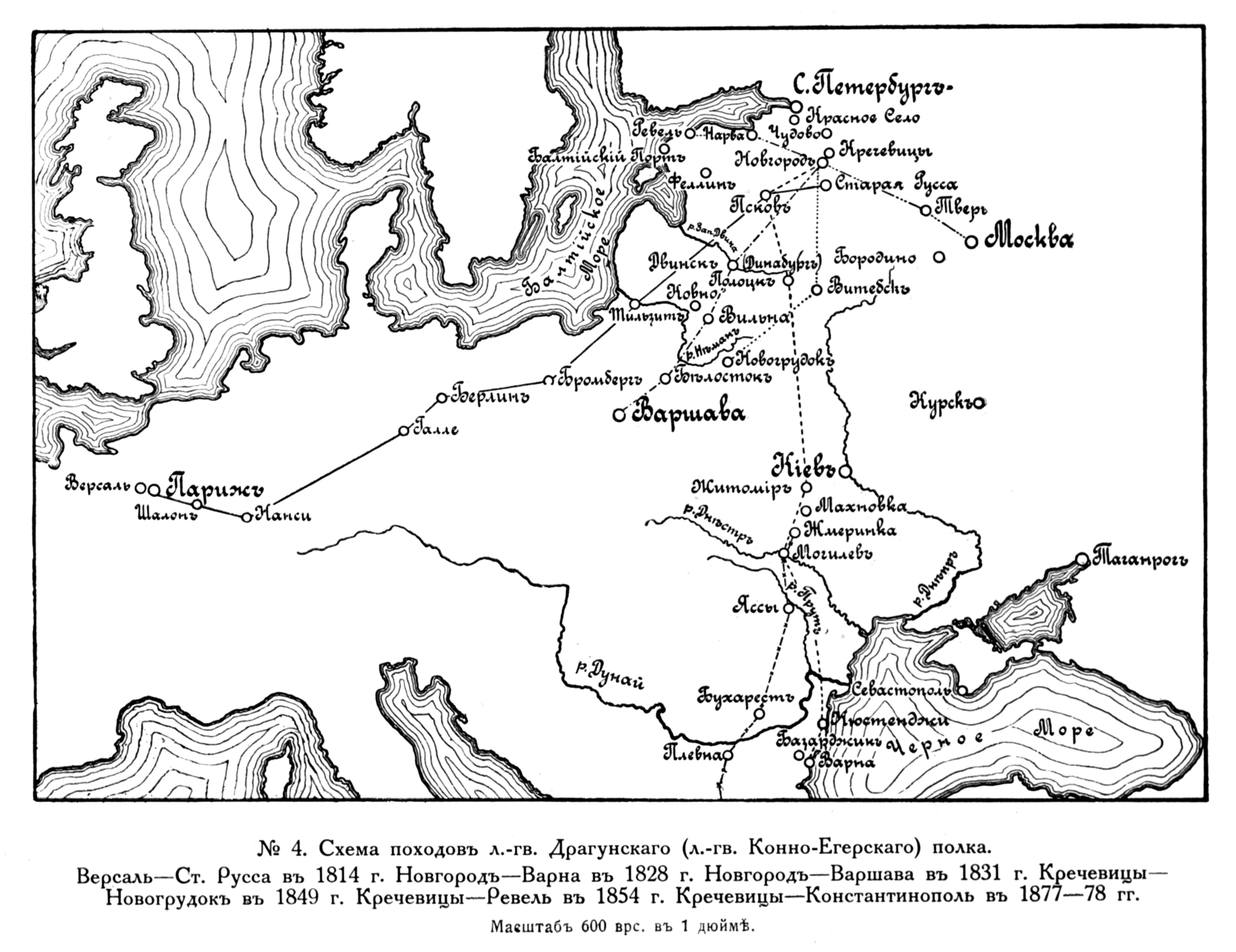 Схема походов лейб-гвардии Драгунского (лейб-гвардии Конно-Егерского) полка. Версаль - Старая Русса в 1814 году; Новгород - Варна в 1828 году; Новгород - Варшава в 1831 году; Кречевицы - Новогрудок в 1849 году; Кречевицы - Ревель в 1854 году; Кречевицы ..