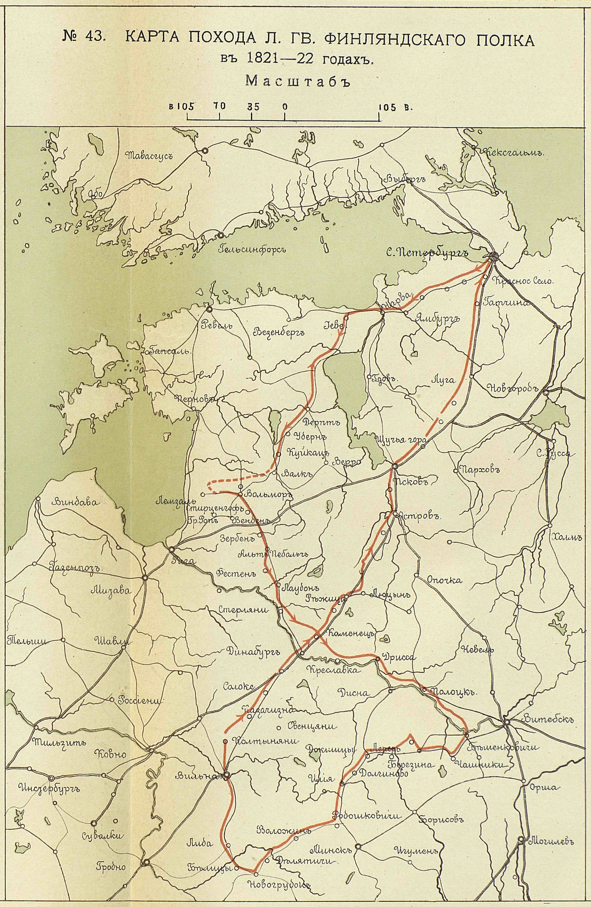 Походы Лейб-Гвардии Финляндского полка в 1815 и 1821-22 годах. Карта похода Лейб-Гвардии Финляндского полка в 1815 году