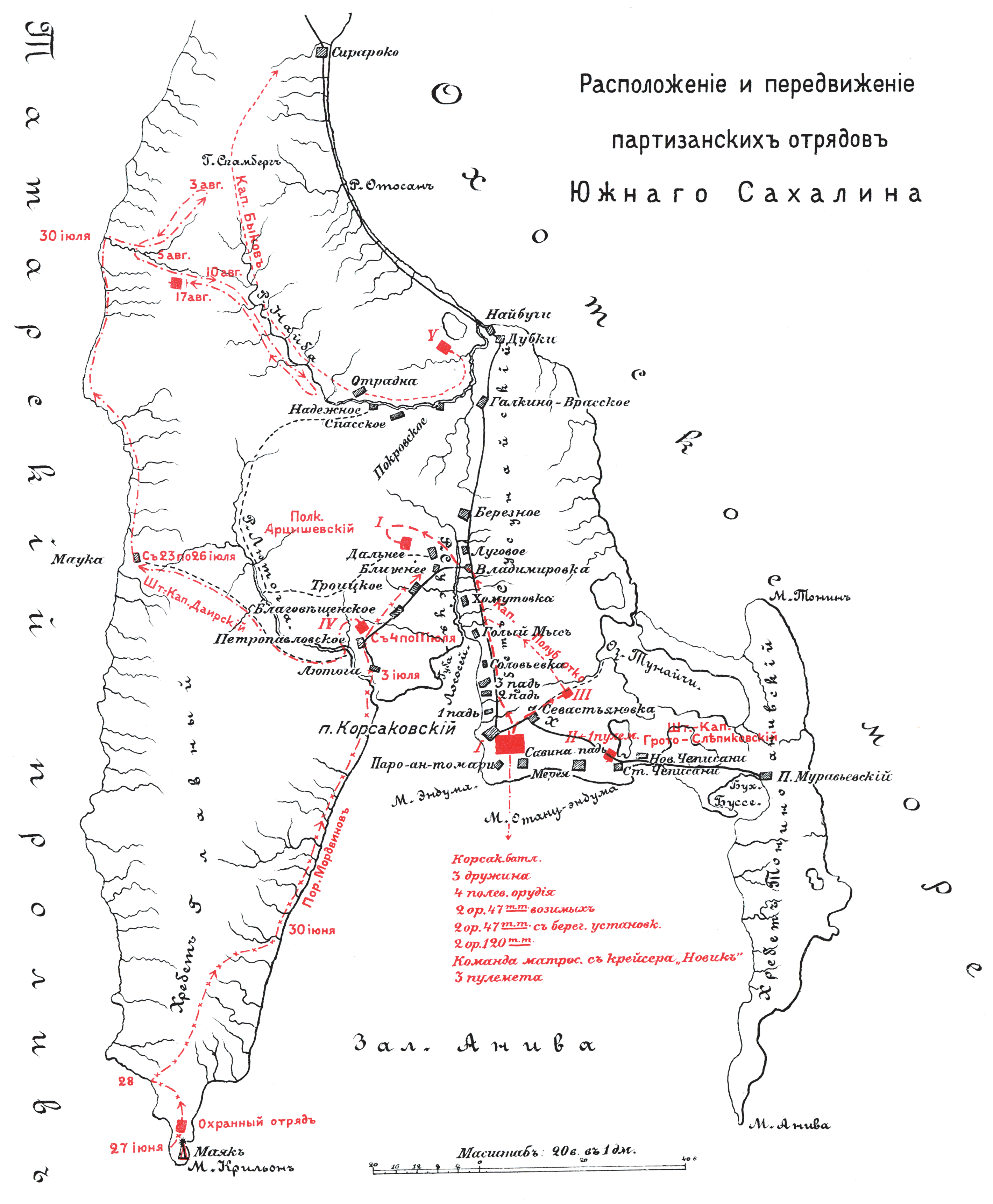 Расположение и передвижение партизанских отрядов Южного Сахалина