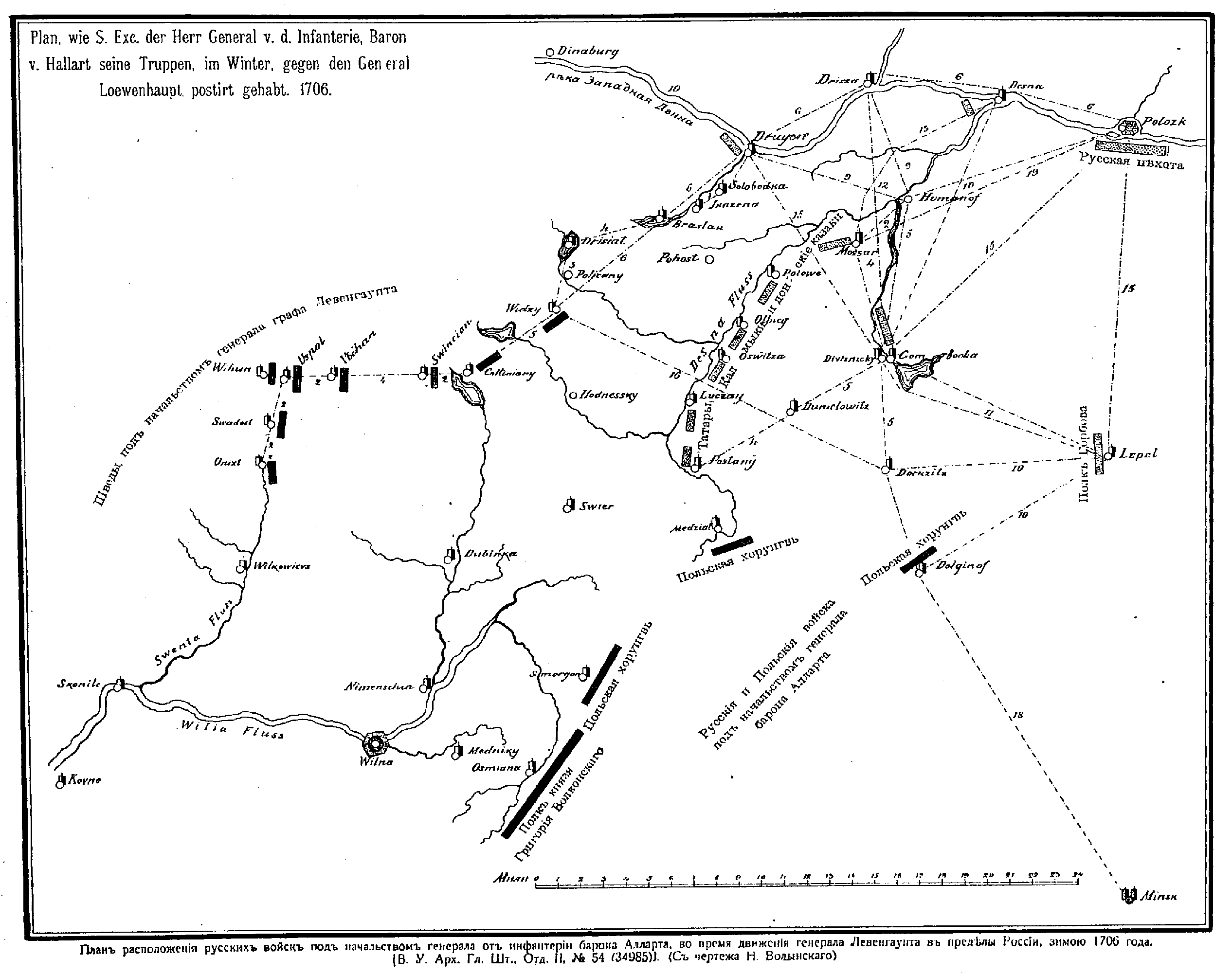 План расположения русских войск под начальством генерала от инфантерии барона Алларта, во время движения генерала Левенгаунта в пределы России зимой 1706 года. (Военный Ученый Архив Главного Штаба, отд.II, №54) (С чертежа Н.Волынского)