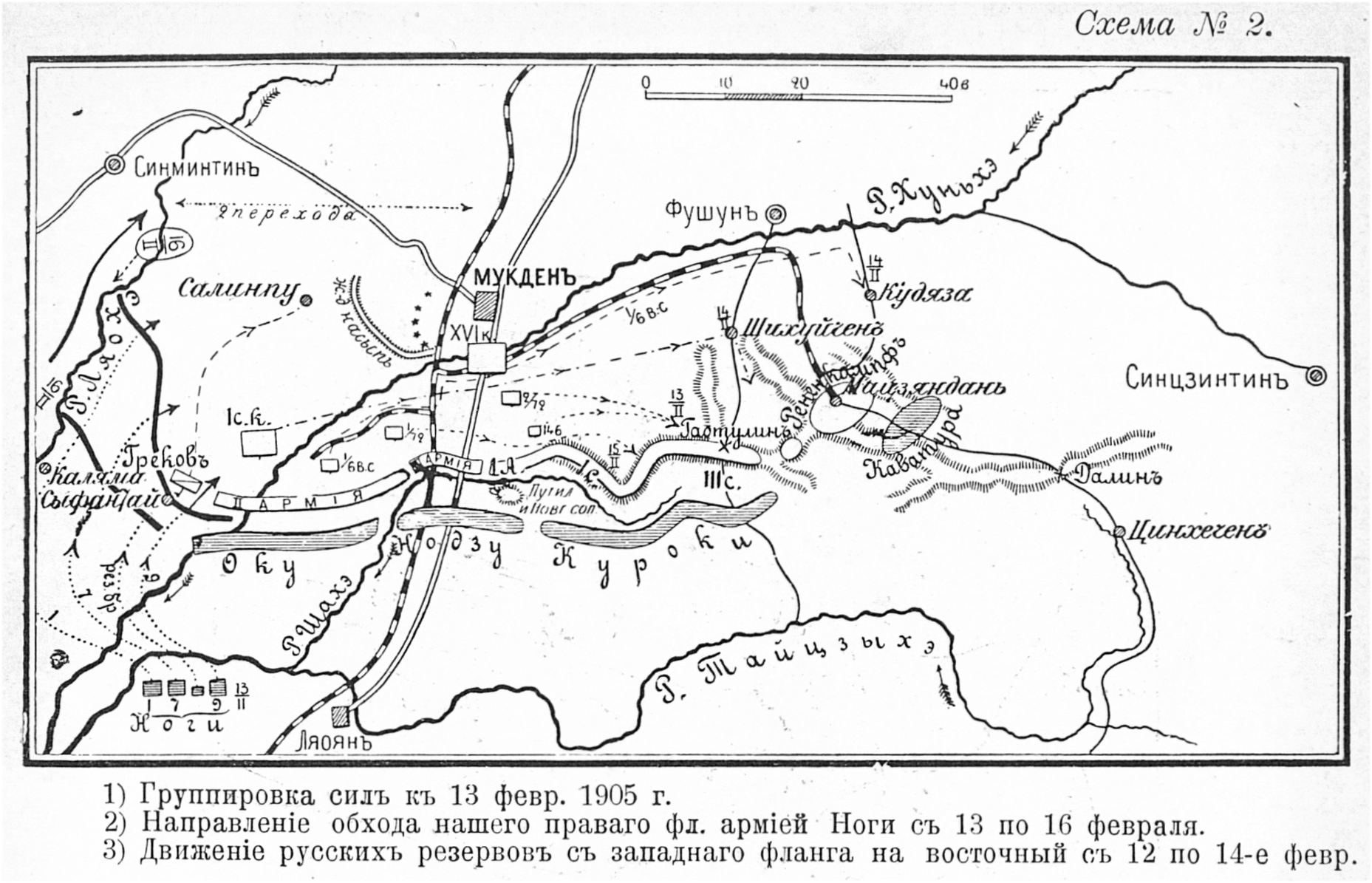 Мукден. 1) Группировка сил к 13 февраля 1905 года. 2) Направление обхода нашего правого фланга армией Ноги с 13 по 16 февраля. 3) Движение русских резервов с западного фланга на восточный с 12 по 14 февраля