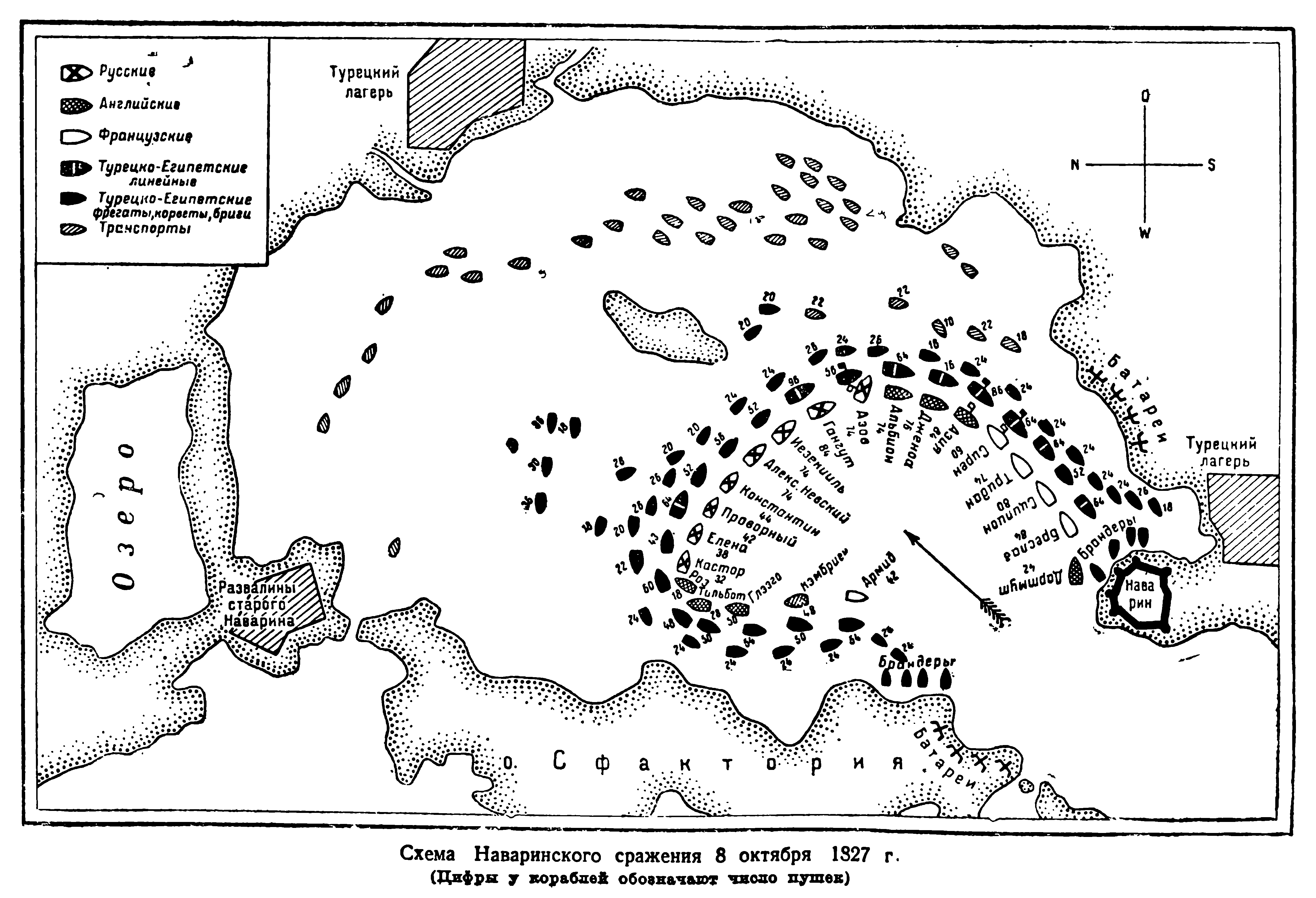 Наваринское сражение 8 октября 1827 года. (Цифры у кораблей обозначают число пушек)