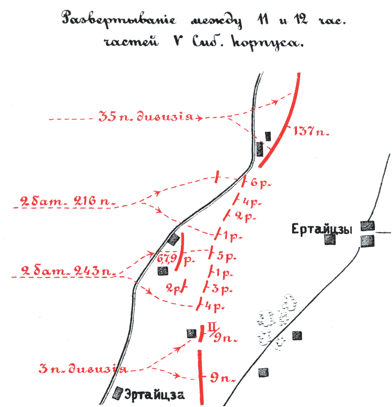 Развертывание между 11 и 12 часами частей V Сибирского корпуса