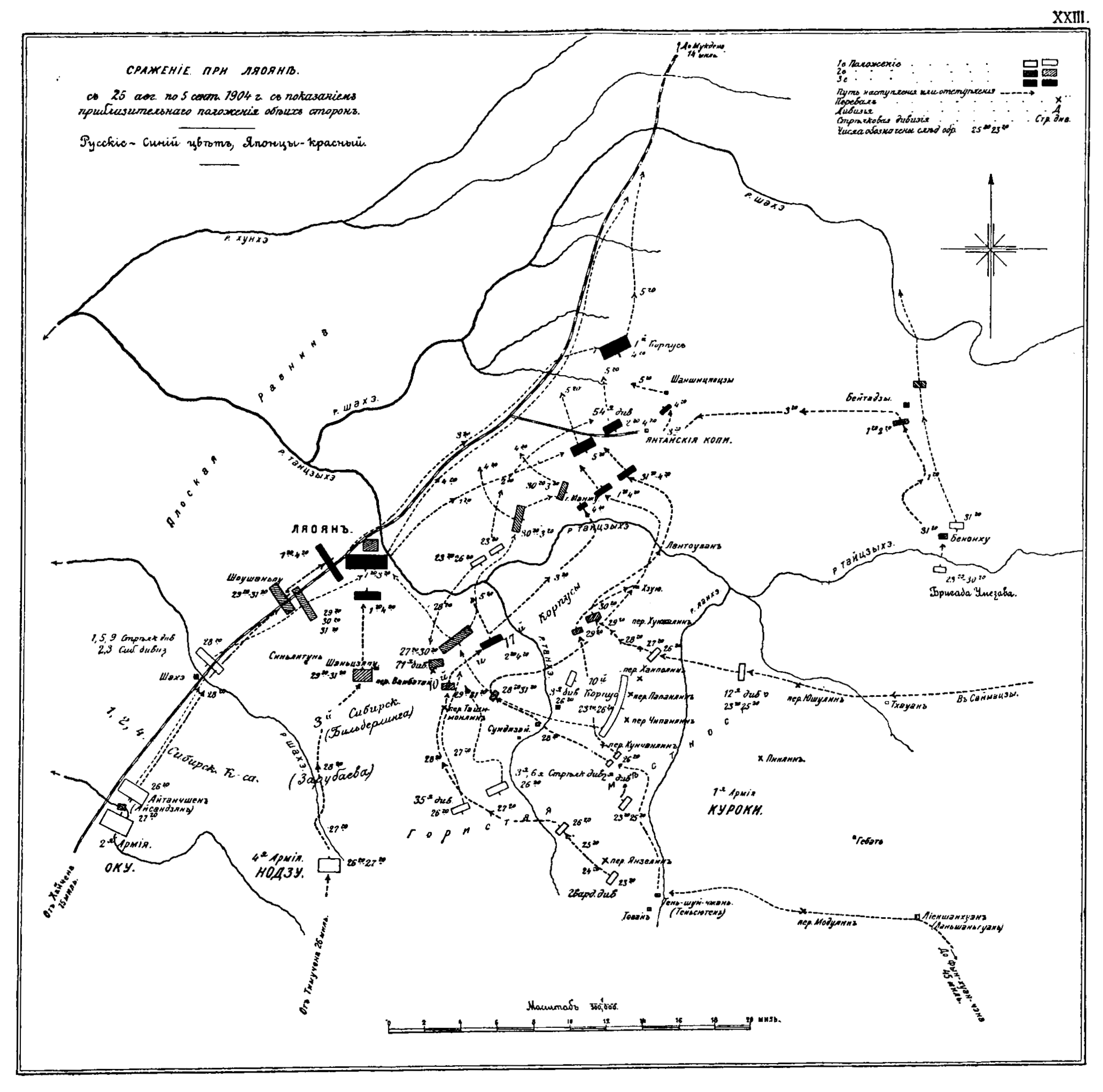 Сражение при Ляояне с 26 августа по 5 сентября 1904 года с показанием приблизительного положения обеих сторон