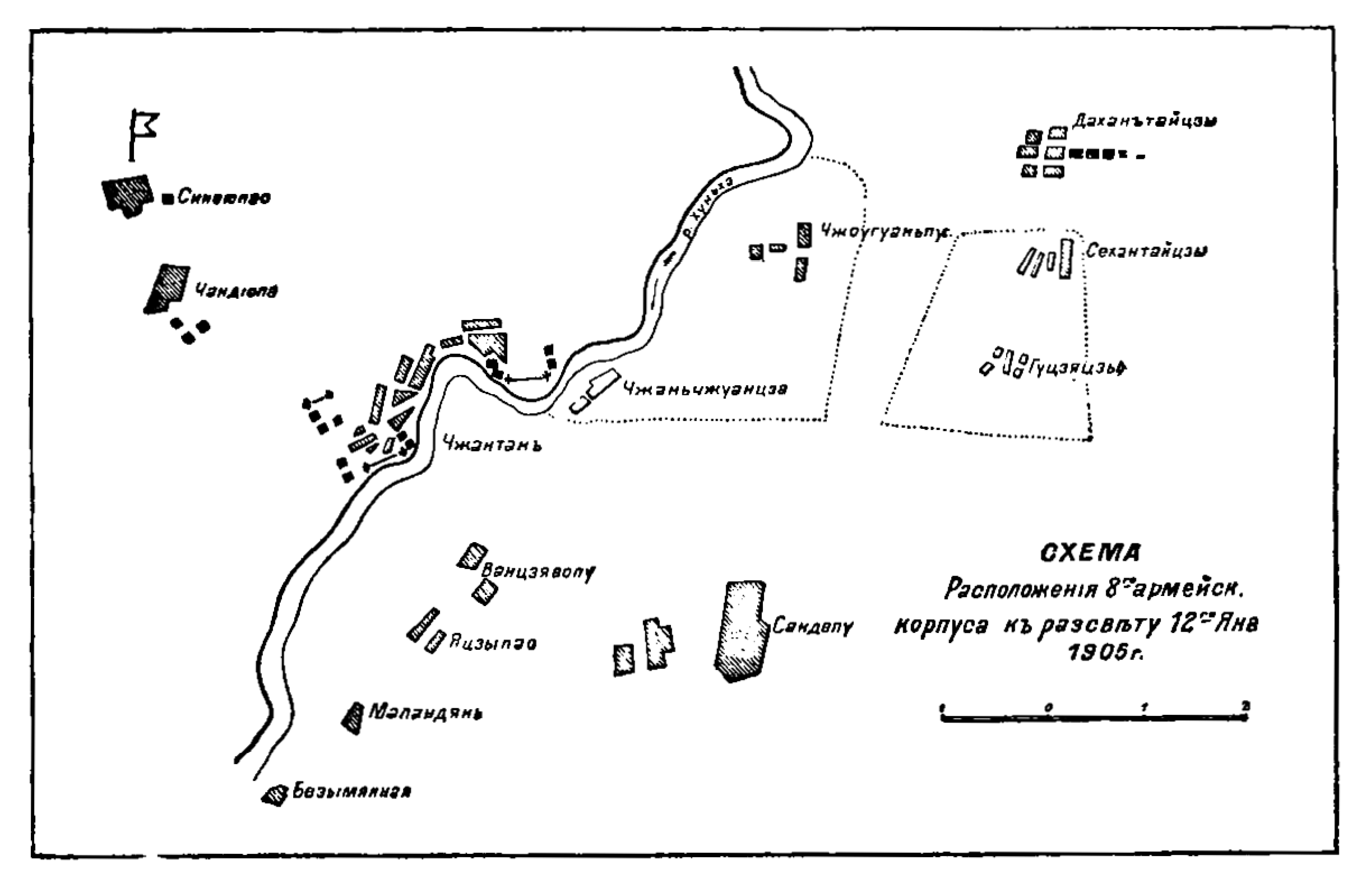 Схема расположения 8-го армейского корпуса к рассвету 12 января 1905 года