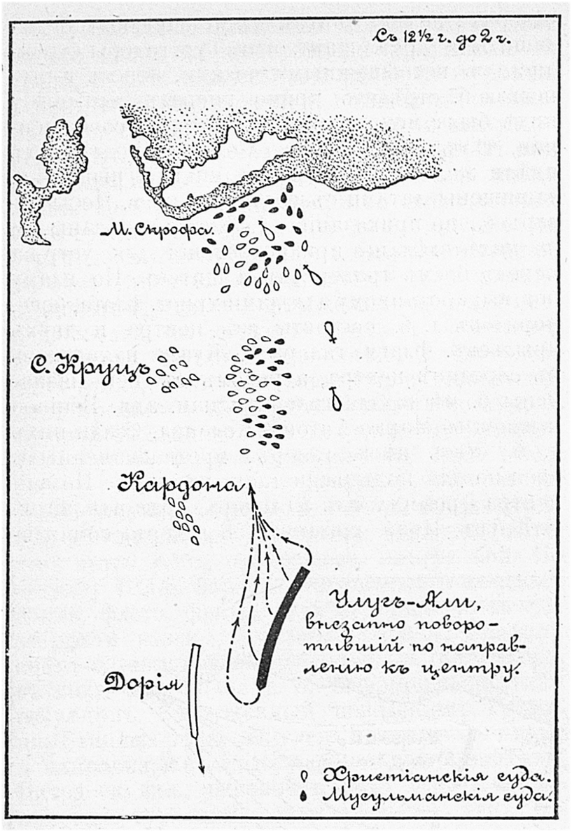 Сражение 7 октября 1571 года у Лепанто между соединенными христианскими и мусульманскими флотами с 12 до 14 ч дня