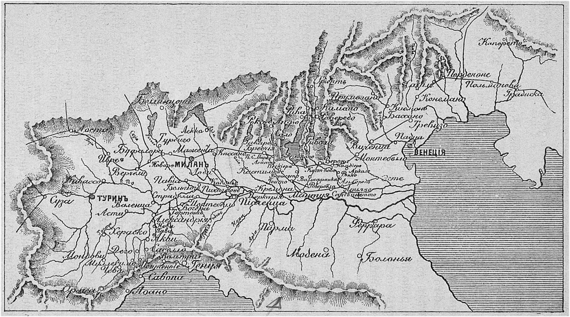 Карта похода Суворова в Италию в 1799 году.